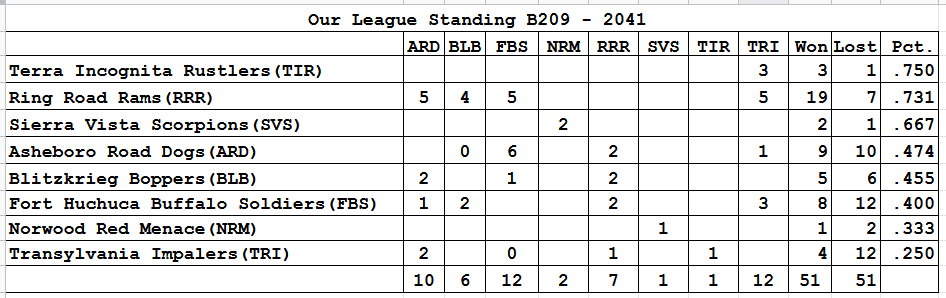 Ring Road remains in the driver's seat, but with a busy schedule for two of their main rivals, Fort Huachuca and Terra Incognita, the race is not over. The Rams magic number is six over the Buffalo Soldiers, with Ring Road having seven left to play, indicative of how wide open the race still is. Even Sierra Vista, which finished it's OL play at .625, remains in the hunt. It should be noted that all of the seven games the Rams have left are with Transylvania, against whom Ring Road is 8-4.