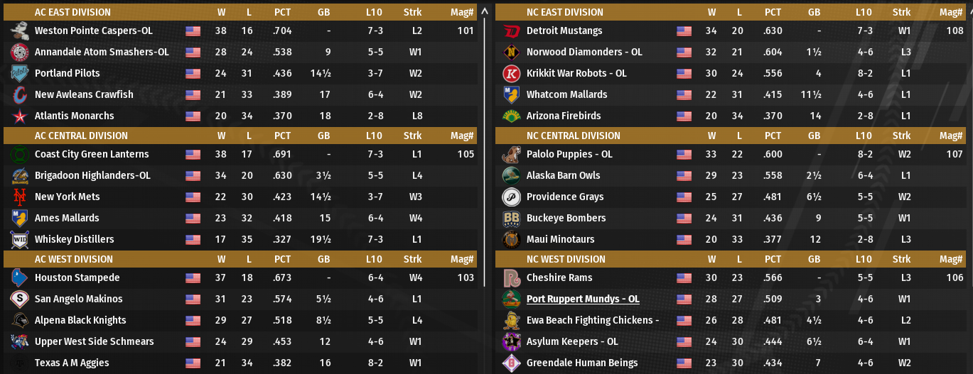 Cary shows as the leader but they are one game short of qualifying for title and being the lone team in the AC their OL schedule is complete. Kansas is currently in the drivers seat. With three OL games remaining if they go 2-1 vs. Highland in that series they clinch title. Shinbone is the only other team with games remaining, I didnt do the math but it seems they are close to, if not eliminated even if they win their seven remaining games. In PT play Cary holds a 3 game lead in the WC in the AC while over in the NC Kansas trails in its division by 3.5 and currently holds down the top WC spot. Meanwhile Coney Island has punched its ticket back to Gold next week. The Warriors celebrated their lack of success with Champagne flowing in the clubhouse. Clinching so early really takes the pressure off, nothing worse than the tension of battling for that final spot as the season winds down. |