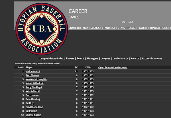 Both in game leaderboards and the almanac are showing a player who actually didn't even lead the league as the single season leader for saves. The leaderboards for career saves though is correct for all players. However the single season list is missing the 3 players who actually have had more saves in a single season. This is a historical league started in 1901 about to enter the 1904 season. As seen in the screen shots below, the "leader" for single season saves is Andy Coakley with 7 (remember this is early 1900's ). However, in 1902 Coakley was beat out by another player who had 9 saves that year (humor here: that guy's name is Blewitt, not exactly what you'd expect for a Closer ) and then in 1903 a different player got 8. Both of those guys do NOT appear in the single season list.Of course the almanac is just html files so I can manually edit those, I did that for the 1902 almanac but the error has reappeared in 1903 and I suspect it will continue forever. So is there a way to fix this in game so that the future almanacs will also be fixed? Thanks in advance Also, this is the Mac version 21.6 Build 83 bought through the Apple App store |