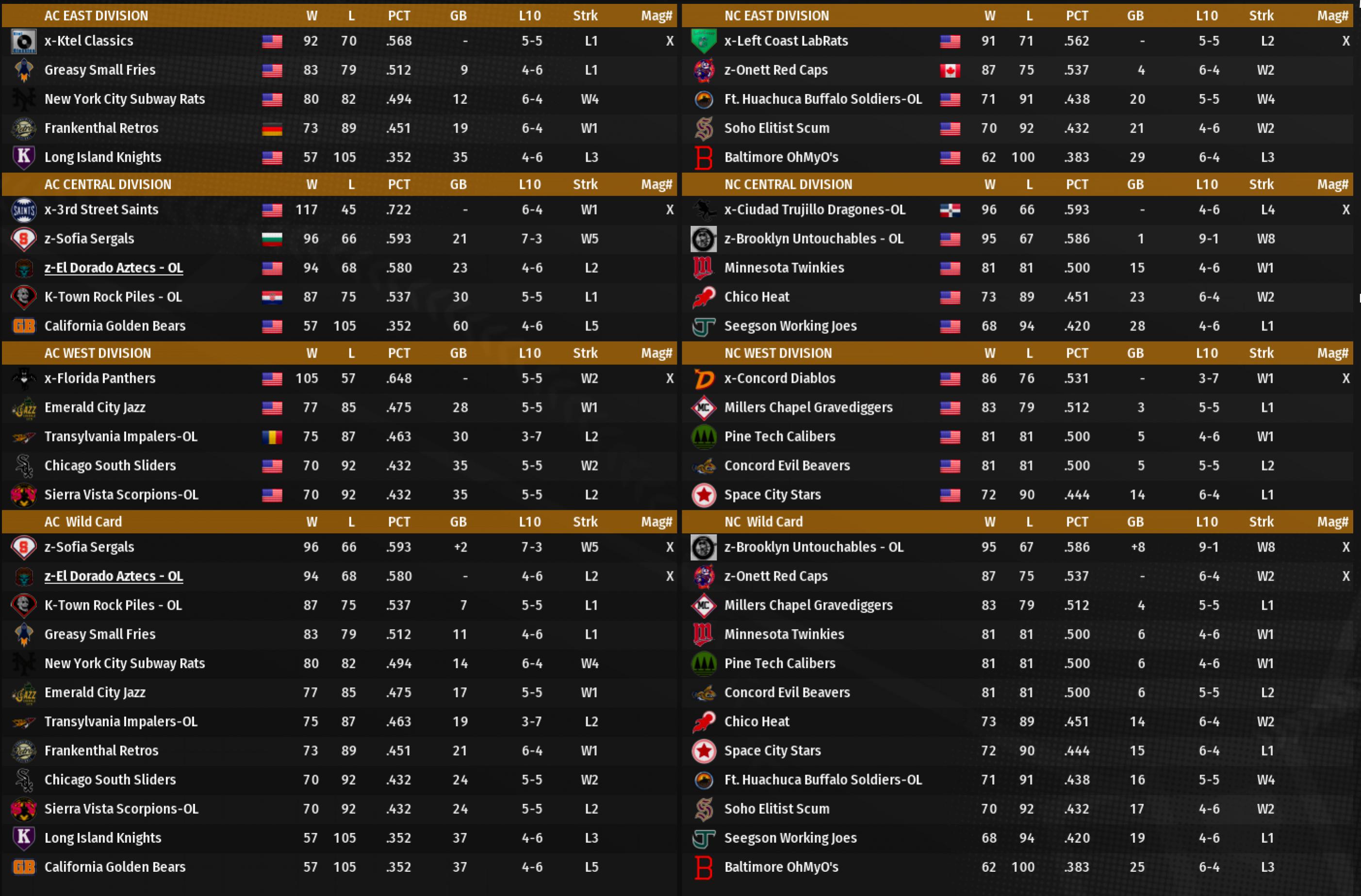 I've been having trouble reaching the forums the past two days. Anyone else having the same issue? Here are the OL Playoff B275 teams: Ciudad Trujillo Dragones (NC Central Division Champion) Brooklyn Untouchables (NC Wildcard) El Dorado Aztecs (AC Wildcard) The Aztecs had a tough Aug/Sep going 24-30 in that stretch. The Brooklyn Untouchables are very hot heading into the playoffs with an 8 game winning streak and 22-6 in September.