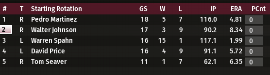 Day Two and I'm still in the hunt, although it's difficult when you only have 1 starting pitcher with an ERA below 5. That would be Warren Spahn who was named pitcher of the month in April AND May. He is 11-0 in 11 starts and leads the entire league in ERA. Tom Seaver is over 7 so moved him to the bullpen in favor of 99 Maddux. My bullpen which I figured to be my weak link is actually #1 in the conference!