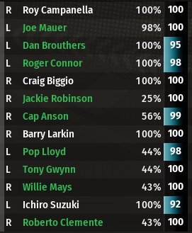 The regular season pattern seems to be 1) slow start 2) hot summer 3) September swoon. And so it was in 2049, where the Magpies were tied with about 10 to play and facing a 4-game set with the team they were tied with. They lost all 4, of course, as part of a 7-game losing streak, however, I did manage to log on early enough Saturday night to insure Face Walter Johnson would be available for the wild card game and 104 overall wins isn't exactly bad.