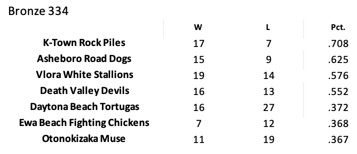 Despite their success in OL, the Rock Piles and Road Dogs are only on the edge of the playoffs, each trying to secure a wild card spot. Ewa Beach and Vlora are leading their divisions. And three teams are solidly in relegation at the moment. |