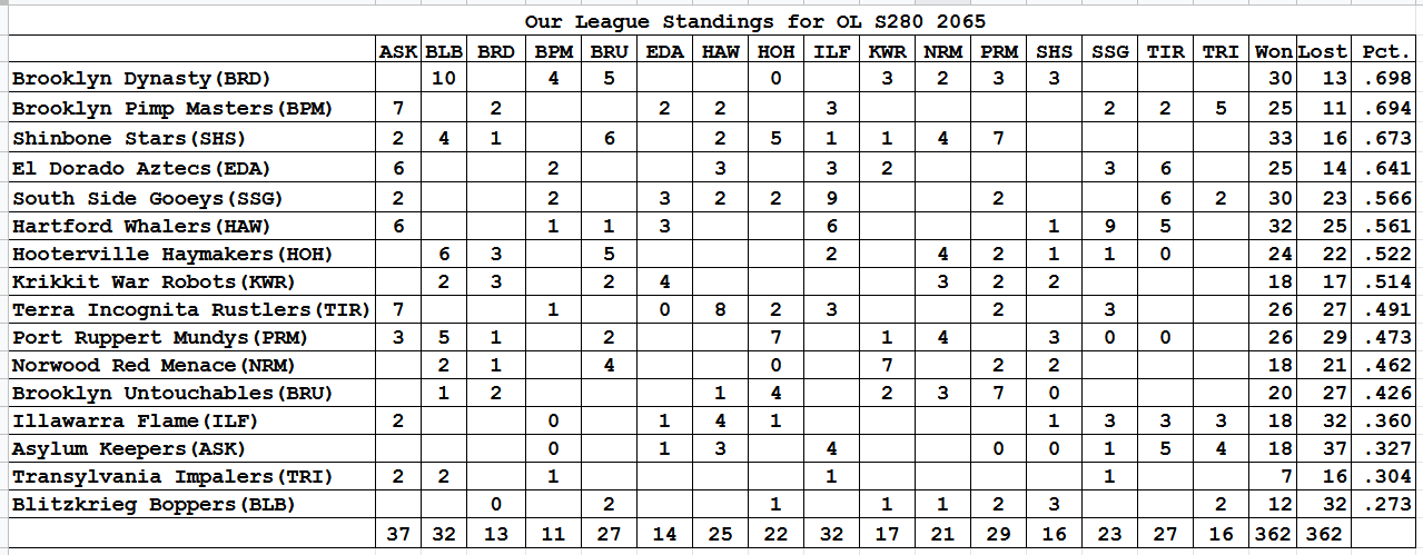 The Pimp Ministers would seem to have the easiest route, with nine games remaining, six against Transylvania, and three against Blitzkrieg, the two most prolific losers this season. The Dynasty also appear ready for a stroll down Easy St., as they have seven to play, with four against the Boppers, and a season-ending three game set in Transylvania. Shinbone has 19 to play and would probably need a near flawless record given the relative weakness of the Brooklyn teams' opponents.