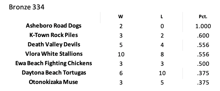 Despite their success in OL, the Rock Piles and Road Dogs are only on the edge of the playoffs, each trying to secure a wild card spot. Ewa Beach and Vlora are leading their divisions. And three teams are solidly in relegation at the moment. |