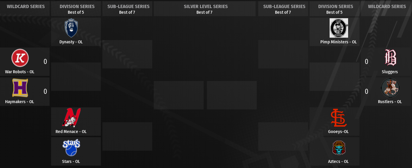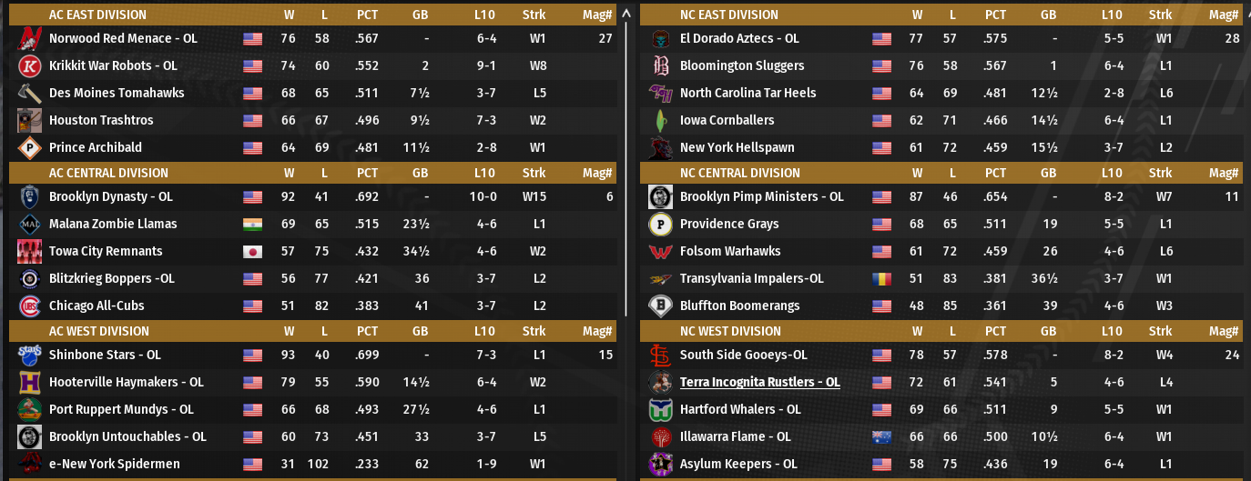Cary took care of business down the stretch to claim the OL crown (though for the "little victory" Waffletown went 10-9 against them for the year). Playoff overview... Southpaws were 22 games better than any other team in the league to nab the top seed. In the NC Central, Cuidad Trujillo, Flatbush, and Munuscong Bay all finished with identical 80-82 records atop the division. Flatbush emerged from the three-way playoff with 2 wins to claim the division title at 82-82. Waffletown will host Weston Pointe in the wildcard match (two 100+ win teams in the freakin' wildcard ); the winner getting the honor of being crushed by Cary ![]() chance of two OL promotions to Diamond, guaranteed at least one. No relegations. my prediction: After a 105 win season but still finishing 26 games back of the division lead, Waffletown will choke in the wild card game and be one-and-done. |