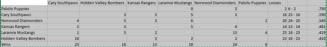 Here are the Diamond results. Palolo had the best percentage, but only played 8 OL games, so Cary takes the OL title.