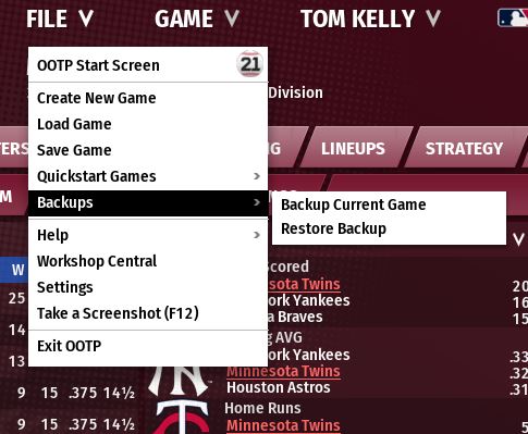 You click on file and click on backups and then click on backup current game. So its impossible for you to restore from backup when you have never created a backup of your game. A saved game is not the same as a backup. When you close OOTP you are SAVING the game not backing up the game. In the screenshot is the only way you can make a backup of your current game. That file, when created, goes into your backup folder. Here is my backup folder because I do keep backups. If your game crashes, then reload it by clicking on LOAD GAME on the OOTP Home Screen which is in the 3rd picture. Please click on LOAD GAME on the home screen because I want to see what is in you load game folder. Show that, its my 4th picture. I am thinking I am coming to the conclusion you are confusing a SAVED GAME with a BACKUP COPY of your game. Please load OOTP 21 and click on LOAD GAME and show us that picture when it comes up. Because if your saved game folder has no info it would be impossible for you to load into your game and if you are not doing actual backups, then yes, your backup folder will be empty. |