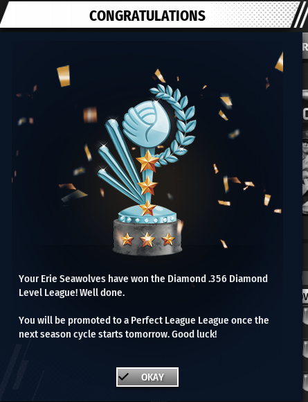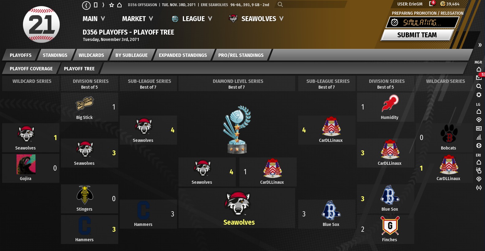 Well, after nearly 20 weeks, the Seawolves are going back to Perfect. Ironically, the last time the Seawolves won Diamond they were 96-66 and went all the way as a 2nd wildcard. This week, they were a 2nd wildcard after going 96-66. hmmm.