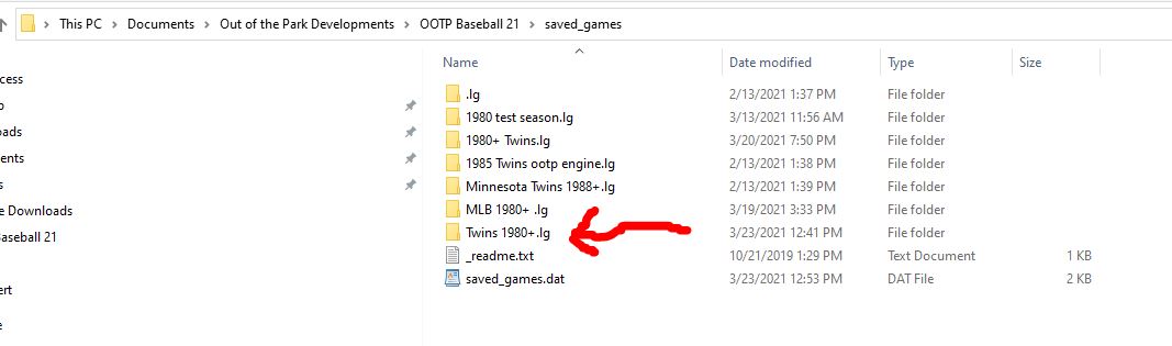 You name your games when you create your games. That is what becomes your saved game names in your saved game folder and it is also what is used to name your backup name as well. If you choose to change the name of your folder then you rename it under file explorer. But, even though I have already posted this, I will do it again. but to see my original post of this same folder, look here https://forums.ootpdevelopments.com/...2&postcount=48 Even The Game posted what was in his folder here. https://forums.ootpdevelopments.com/...1&postcount=51 This is what is under my Twins 1980+ folder when I click on it. |