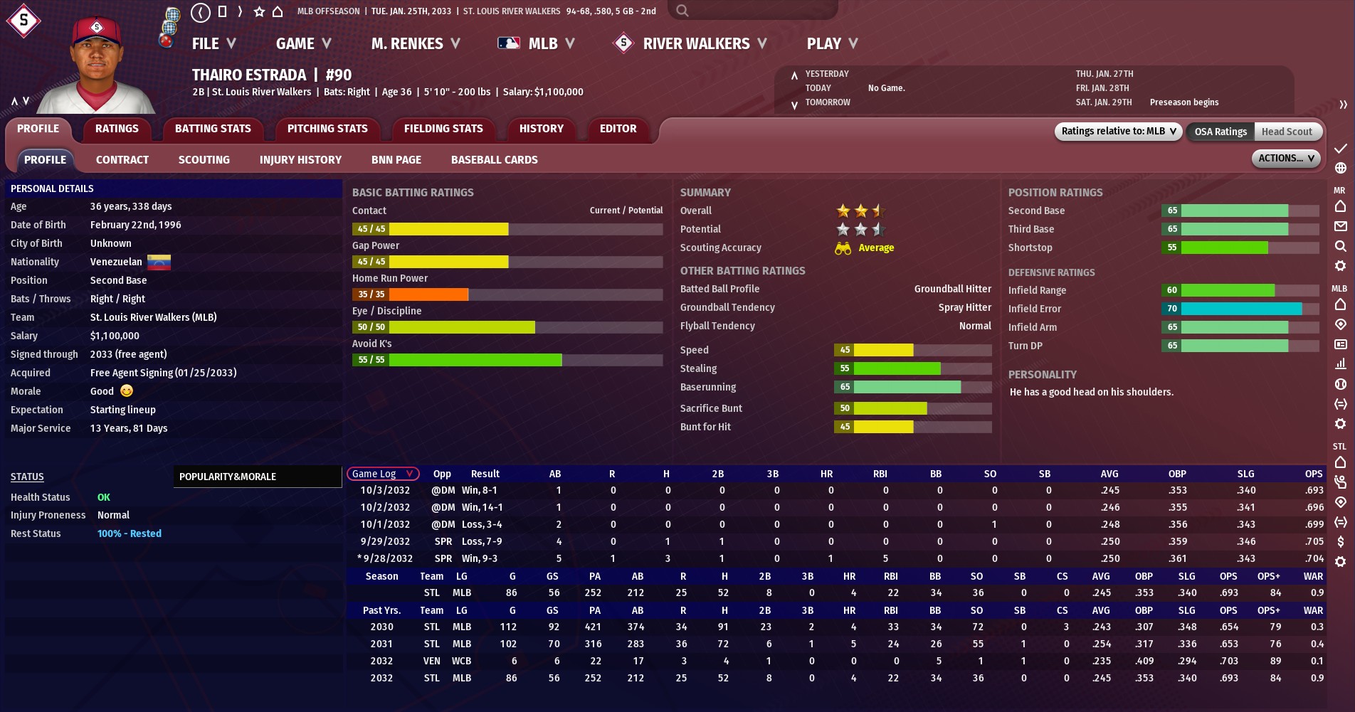 Estrada, 36, got into 86 games (56) starts with the Walkers in 2032, during which he batted .245 with four homers in 22 RBIs. In five seasons in St. Louis, he has played in 408 games with the Walkers, during which he has batted .251 with 24 homers and 135 RBIs. |