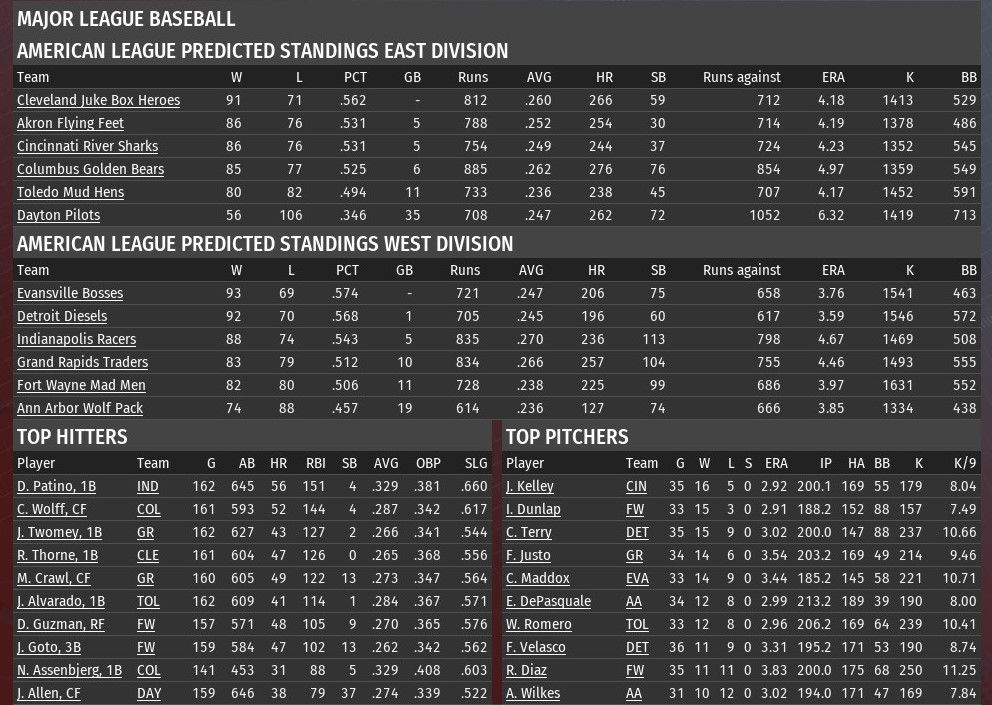 Meier, 28, primary numbers in 2032 were not impressive -- he was 6-16 with a 3.03 ERA in 32 starts -- but what jumps out is his 1.07 WHIP and 4.9 WAR. Meier was spent his four seasons in the majors -- all with the Mad Men --moving back and forth between the rotation and the bullpen. Overall, he owns a 25-39 record in 154 games (83 starts) with a 3.56 ERA and three saves. Thompson, 23, has been a top prospect for the Walkers for a few seasons but has had his path to the majors blocked by Jose Segura to be the team's primary center field. In 2032, Thompson played in 31 games for the Walkers hitting .236 with four homer and 11 RBIs. Overall, Thompson has played in 82 games in the majors over two seasons and hit .218 with 14 homers and 41 RBIs. Haas, 26, is another top prospect who has struggled in his opportunities to succeed at the major-league level. In 2032, he started 13 games for St. Louis going 2-6 with a 6.66 ERA. Overall, Haas has started 18 games for the Walkers going 3-7 with a 6.35 ERA. A veteran right-handed reliever, Grissom, 32, spent just the 2032 season in St. Louis during which he got into 72 games and went 3-7 with one saves and 3.79 ERA. Grissom has been in the majors since 2026 -- he spent six seasons in Columbus before joining the Walkers -- and has pitched in 371 games. He owns a record of 25-23 with three saves and a 3.96 ERA. |