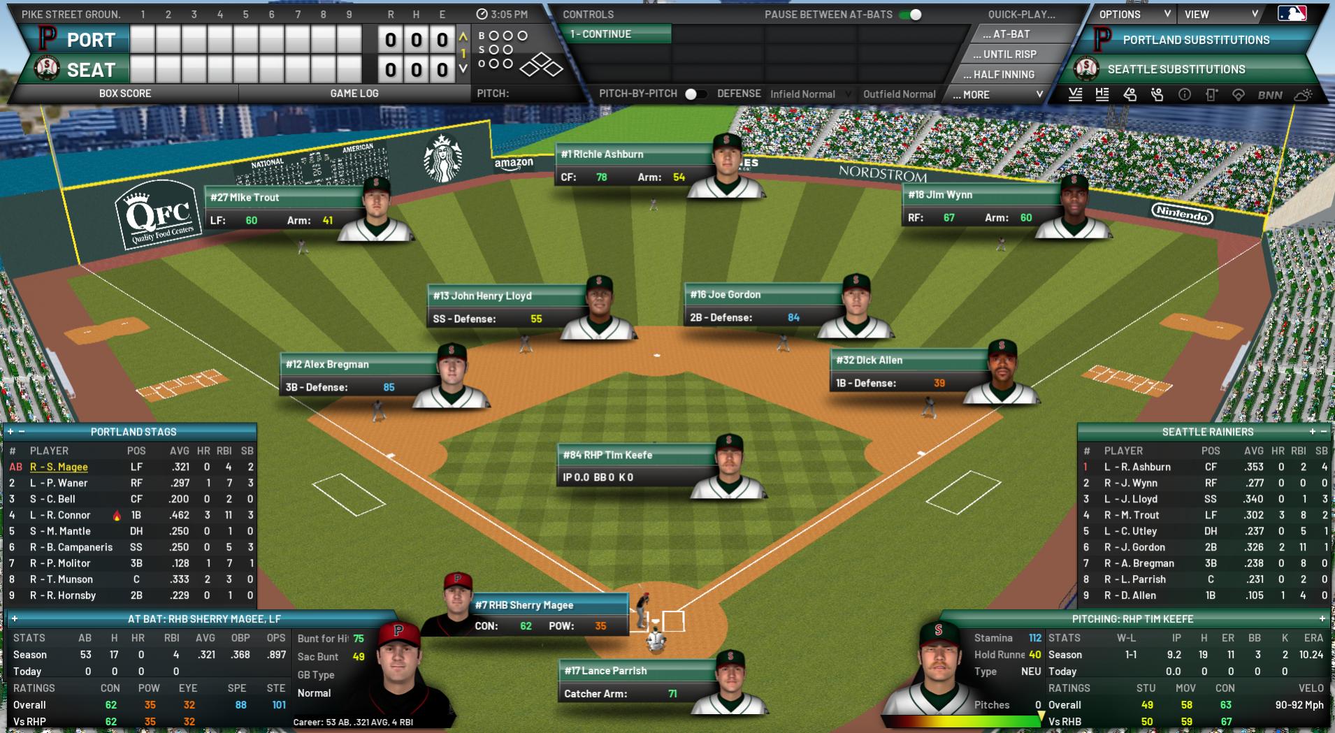 Tonight the Seattle Rainiers play host to divisional rivals Portland. The two teams played out a fantastic game last night, with the home team sneaking by 4-3 thanks to a walkoff RBI double by backstop Lance Parrish, and they do match up very evenly on paper so I’m expecting another tight one this evening. Tim Keefe on the mound for the Rainiers while the Stags are going with Jim Whitney. Neither has exactly set the league on fire so far, something I’m sure they’ll be keen to change tonight. Seattle struggled early, but are riding a 4-game win streak including a sweep of New York that has got them back to .500 ball. The Stags are at 4-9 and certainly playing better of late after losing their first four of the season. Before we get started, our field reporter Juliana Scott is down in the Rainiers dugout with manager, Lou Piniella. Juliana, over to you. Juliana Scott: Thanks Nik. Appreciate your time, Lou. A slow start, but 4 wins on the trot now and your squad looks to be coming together nicely. What do you think has been the difference over the past few games? Lou Piniella: Oh, no doubt, we’ve pitched better. We’ve only given up 10 runs in those four wins and when you do that you’ll usually come out on top of more ballgames than you'll lose. JS: Just 43 runs scored in 12 games, lowest in the league--you can’t be too happy about that. LP: No, that’s certainly an area we have to be better in. Trout and Gordon have been good, Ashburn as well, Lloyd is really looking promising. But a few of the other lads have been slow off the mark and our hitting in the clutch has been poor so far, which means we’ve left a lot of runs on the deck and lost a couple of games we should perhaps have won. But it’s a young group all new to this level, so we always expected some teething problems such as these across the board. JS: Last night’s game was scoreless thru 8 and then you fell behind 2-0 in the 9th. How did you get the group to regather after that and get the win in dramatic fashion? LP: We felt we’d been unlucky not to score a couple of times and, as I said, we just weren’t delivering at key moments. But we knew we were far from out of it and I was really proud of how the guys lifted to get us home in the end. Lance’s at-bat that resulted in the walkoff run was more along the lines of what we’re looking for. He hung tough, fouled a couple off, and then got his pitch and drove it. JS: You’ve got Tim Keefe pitching for you tonight, tell us a bit more about him. LP: I doubt Tim will win many strikeout titles, but he has excellent control and won’t give up too many homers. He’ thrown too many straight down the pipe in his starts so far, and in this league that will get you treated the way he was. So we’ve been working on him mixing his pitches up and staying ahead in the count so he can nibble a bit more and pressure the hitters into false swings. Hopefully that’ll show tonight. If he can get his changeup working the way we know it can he’ll be a different pitcher altogether. JS: And what do you know about his opponent, Jim Whitney? LP: Only that I hope he pitches tonight more like he did in his first game than his last one (laughs). From what we can tell he’s not too dissimilar a pitcher to Tim in a lot of ways. Not overpowering stuff, but will wear hitters down with good control and a decent array of pitches. We’ll be looking to attack him early in the count because if he gets ahead of you then he’s tough to beat. JS: Just before I let you go, you mentioned this is a new, young group – what have you found to be the most challenging aspect of managing them so far? LP: We know we have a good bunch of ballplayers, but we also know they are raw and will take time to come on as we expect, to gel as a unit. But really for mine, the toughest thing is getting them all enough game time while still using each player in the right situation so that we have the best chance of winning games. That will become easier as we all get to know one another better, but until then it’s something we’ll have to keep close tabs on. JS: Great, Lou, thanks again for your time and all the best for tonight’s game and the season ahead. LP: No problems Juliana, any time at all. Thanks Juliana, and of course thanks to Lou. OK, after this quick word from our sponsors we’ll be back with the first pitch. TOP 1ST A messy start for the home side as Portland scores an unearned run after Gordon makes a two-out error and Mantle singles it in. Portland 1, Seattle 0 BOTTOM 1ST The Stags return the favour when, after Ashburn leads off with a double, an error by the 3B Molitor puts men at the corners with none out. Lloyd fails to bring in the run, hitting into a fielder’s choice, and then Magee ends the threat by taking a flyout from Trout and turning it into a double play at home. Lou Piniella won’t be impressed with that missed opportunity. TOP 2ND No dramas for Keefe in a 1-2-3 inning. BOTTOM 2ND Whitney retires them in order. TOP 3RD Nothing doing for the Stags. BOTTOM 3RD Parrish leads off with a hit and scores on a two-out double by Jim “The Toy Cannon” Wynn. Portland 1, Seattle 1 TOP 4TH A red-hot Roger Connor starts the inning off with a single, and another one by Mantle moves him to second. Keefe strikes out Campaneris for the first out of the inning, but then Connor swipes third to put him right under the pump. A popout by Molitor eases the pressure somewhat and he gets out of the jam when Parrish grounds out. BOTTOM 4TH Whitney with a three-up, three-down inning. TOP 5TH More struggles for Keefe. Rajah Hornsby leads off with a single and ends up at third when a caught stealing attempt by Parrish ends up in the outfield. This time, he can’t escape unhurt as Magee singles the runner in. Waner bunts him over to second and then Bell doubles to extend the visitors’ lead. A Mantle single leaves men at the corners with two outs, but Keefe ends the inning with a flyout. Portla