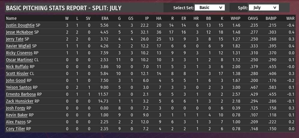 Starting Pitcher of the Month: Jerry Tate -- The 30-year-old right-hander went 2-2 with a 3.14 ERA in four starts. He pitched 26.0 innings, during which he struck out 15 and had a 1.27 WHIP/ Relief Pitcher of the Month: Oscar Martinez -- The 29-year-old lefty got into 11 games during which he posted a 2.53 ERA over 10.2 innings. He struck out eight and had a 1.12 WHIP. |