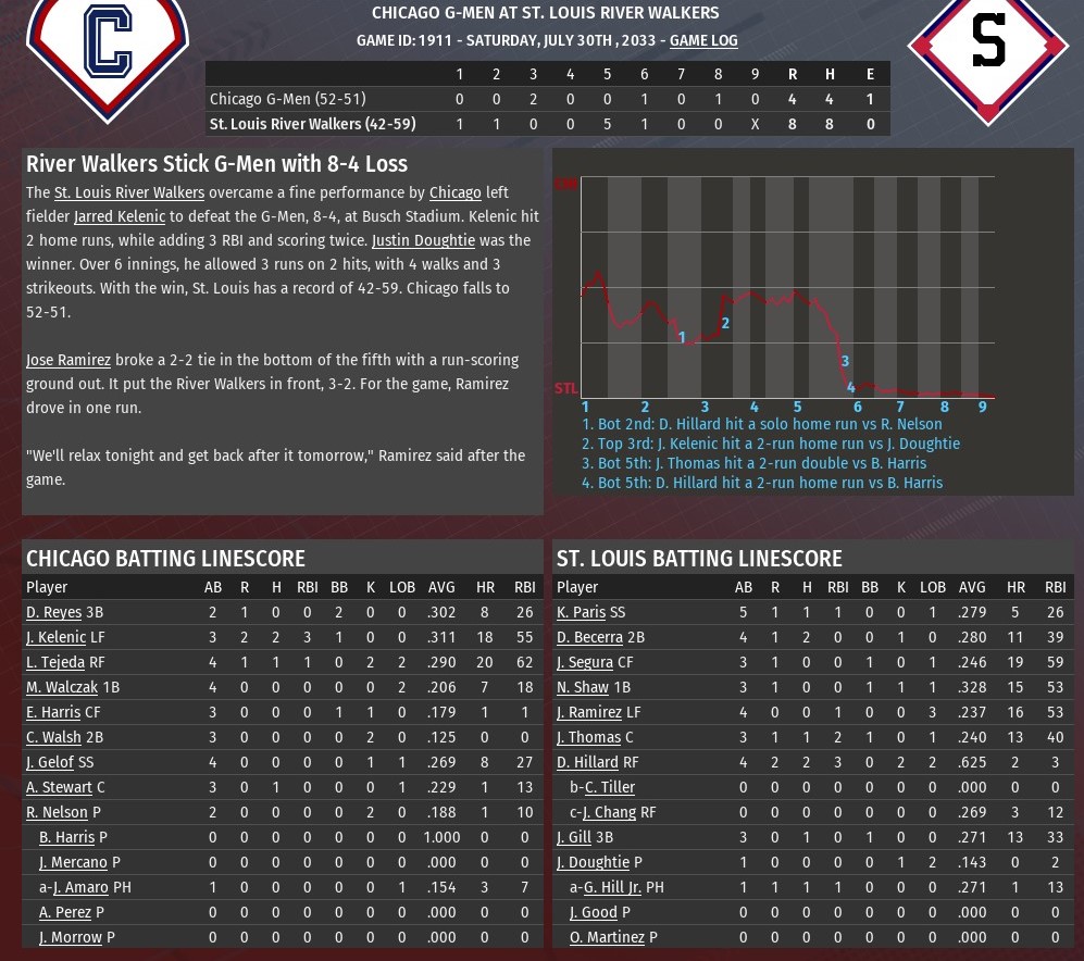 Scoreless through nine innings, Chicago busted loose for four runs in the top of the 10th inning and went on to defeat St. Louis 4-0 at Busch Stadium (2006). The win allowed the G-Men to take the finale of the three-game series after dropping the first two. Chicago starting pitcher Jonathan Stiever went 6.1 scoreless innings, allowing four hits while striking out three and walking one. River Walkers starter Jesse McNaboe wasn't nearly as efficient, allowing nine hits, but he didn't allow a run either in his eight innings. The G-Men finally got things going in the top of the 10th, starting off against reliever Scott Rissler. After getting a ground out from Daylen Reyes, Rissler walked Ozzie Albies. Nick Ruffalo replaced Rissler, and things quickly crumbled for the Walkers. Luis Tejada greeted Ruffalo with a single. Jarred Kelenic followed that with a three-run homer. Chicago added another run. Paul Broyles and pinch-hitter Cruz Calderon both singled with two outs off Ruffalo. A walk to Jerry Amaro loaded the bases, and led to Ruffalo being replaced by Cory Tiller. Matt Walczek hit a grounder to shortstop Kyren Paris, which he booted allowing Broyles to score and make it 4-0. Josh Morrow finished off the seventh inning for the G-Men following the departure of Stiever. He also worked a scoreless eighth inning. A scoreless ninth inning set Michael Steinberg (3-2) up for the win. Andrew Perez held the Walkers scoreless in the 10th. |