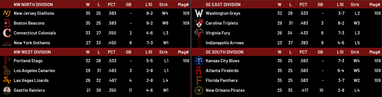 Just a game separates the three top teams, with Connecticut sitting alone in first on 32-24. New Jersey and Boston’s strong home form has helped them keep pace with the Colonials and New York put together a couple of strong late wins to give them some momentum heading into June. West Division A real turnaround for Portland with their 20-9 month leapfrogging them into first place, 3 games clear of both Los Angeles and Las Vegas, who continue to be almost inseparable. Poor old Seattle is having a hell of a time of it, with their run differential having blown out to a nasty -106. They are now 10 adrift of the Canaries and Lizards and already look no hope of being competitive this season. South Division Florida is in the same boat as Washington—a league-best 33-23 record but a run diff of just +6, which compares poorly to both Carolina (+39) and Kansas City (+42), who are tied for second place just 2 games in arrears. New Orleans – 8 GB at 25-31 – are finding it tough going and will need to get things moving in the right direction if they want to avoid being dropped off by the other three. East Division Washington still leads, but now by only 4 games, and this division has really tightened up of late with the last placed Arrows only trailing the Grays by 7. Washington’s -17 run differential despite their 30-26 record indicates they are winning by small amounts and losing big, which is a real concern. I wouldn’t be at all surprised to see Virginia atop this division same time next month. They are 8-2 for their last 10 and have started playing some really good baseball, as their 19-10 May after that horror 6-21 April attests.