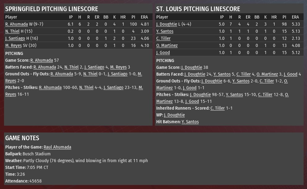 St. Louis jumped on Springfield starting pitcher Chris Hensley and rode that to a 10-2 rout of the Railers at Busch Stadium (2006). The River Walkers put five of their first six batters of the bottom of the first inning on base. The only batter who didn't reach, Kyren Paris, got down a sacrifice bunt. Included in that run were a pair of walks, including one to Daniel Becerra which scored the game's first run. Jovan Gill also had an RBI single. Dan Hillard plated the final two runs of the inning with the third single of the inning. The River Walkers lead would grow to as big as 8-0. Hensley walked three straight batters to begin the bottom of the fourth. A run then scored on a passed ball. Hillard led off the bottom of the sixth with a double off reliever Joseph Hughes. He scored on a Kevin Melendez single. Rick Scott, who had drawn a walk from Hughes, later scored on an Argenis Batista wild pitch. St. Louis starting pitcher Jesse McNaboe didn't allow a run until the top o the seventh inning. McNaboe (12-8) would pitch into the eighth -- he exited after allowing a lead-off single to Mike Murray -- allowing two runs on four hits in seven innings. He struck out three and didn't issue a walk. Yeison Santos finished off the eighth inning, and was on the mound when the Railers scored their second run.. John Good set Springfield down in order in the ninth. |