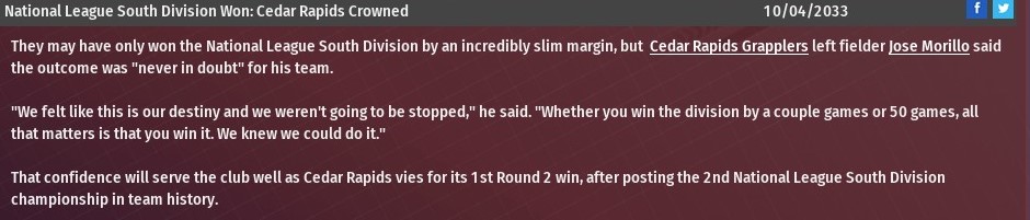 The Grapplers and Railers had finished in a tie atop the NL South with identical 88-75 records. The victory sends Cedar Rapids on the road for the NL championship series, where Games 1 and 2 will be hosted by NL North champ Rockford. The Lightning posted the best record in the Midwest Baseball League by finishing 98-64. The postseason berth for the Grapplers is their first since 2019. |