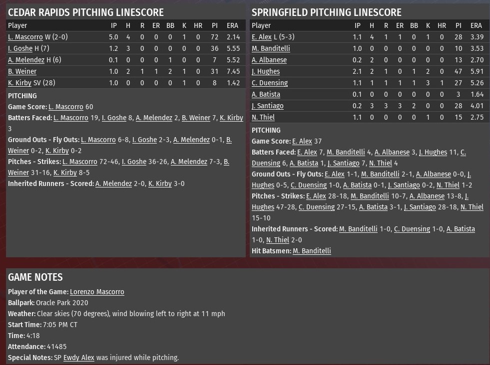 A two-run home run from Fernando Tatis Jr. in the top of the first inning staked Des Moines to an early 2-0 lead, but the Harvesters would not score again as St. Louis rallied for a 4-2 win at Busch Stadium (2006). Justin Oates reached on a one-out single off River Walkers starting pitcher Alex Pazos just ahead of Tatis Jr. 17th homer of the season. Tatis Jr. charged a 1-0 pitch 407 feet over the wall in left field. St. Louis pulled to within 2-1 in the bottom of the second. Jared Thomas singled with two outs off Des Moines starting pitcher Juan Amezquita and scored on a Jovan Gill double. An inning later, the Walkers took the lead on the fifth homer of the season, a two-run blow, from September callup Hector Tavarez. Wes Cohen took Amezquita deep with two outs in the fifth to complete the scoring. Pazos tossed six shutout innings after the Tatis Jr. homer. Overall, in seven innings Pazos (3-7) allowed the two runs on three hits. He struck out four and didn't walk a batter. Cory Tiller pitched a scoreless eighth inning. The Harvesters loaded the bases against Gil Meier in the ninth, but didn't score as the right-hander earned his second save since being called up from AAA. |