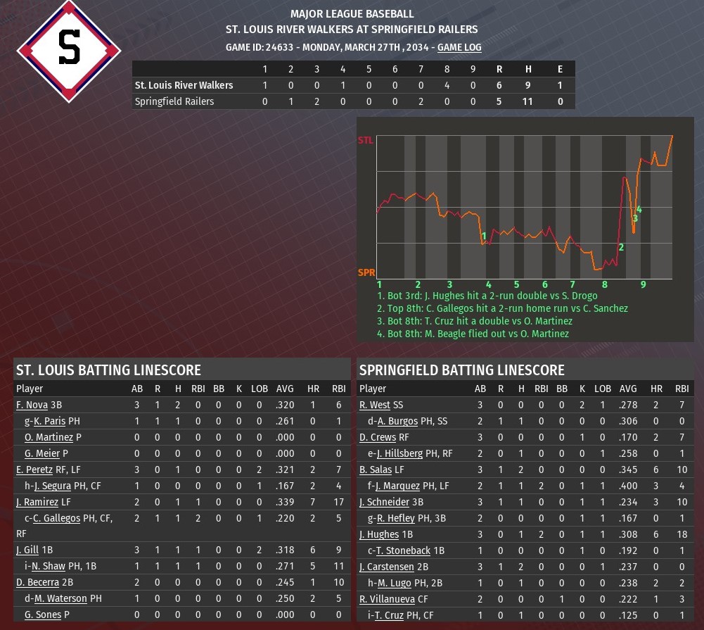 Scott, 29, has spent quite a bit of time in the majors with the Walkers, including as the team's primary first baseman in 2031. In 296 games in St. Louis, Scott has hit .235 with 74 homers and 166 RBIs. Last season, Scott was the MVP of the Pacific Coast League American Conference after hitting .321 with 43 homers and 118 RBIs in 112 games. Baker also has bounced back and forth between St. Louis and Memphis. The 27-year-old pitched in 36 games for the Walkers in 2033, going 1-2 with five saves and a 2.70 ERA. For his career, Baker has pitched in 61 MBL games, owning a 2-3 record with six saves and a 3.11 ERA. Taylor, 25, is better rated defensively as a first baseman but also can play shortstop owns all kinds of power. In 619 minor league games, Taylor owns a .259 batting average with 142 homers and 412 RBIs |