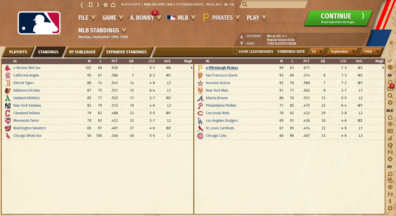 I looked up the players you asked about. Gibson was with the Cards through 67. They traded him in the last year of a long contract. Boston signed Yastrzemski to an 8 year contract before the 65 season so unless traded he'll be there until 72. Since I'm not playing out any games it's hard to get an anecdotal impression of where players are. In response to your questions I sorted all players by age and then looked at the 27 year olds. Glancing at 3 star plus players most are in the "right" place. As I'm typing this it occurred to me maybe I should have looked at 29 year olds. |