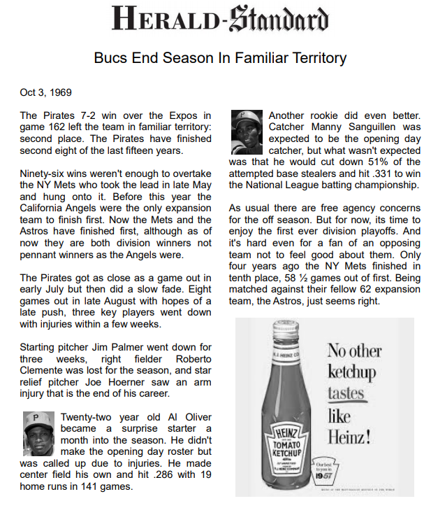 Anyway after dark I could get KDKA in Indy and I listened until I fell asleep. I had to go to school the next day. The game went extra innings. Next morning I heard the Bucs had won. And then they won the next two! With rookies everywhere. Sanguillen, Oliver, Hebner. |
