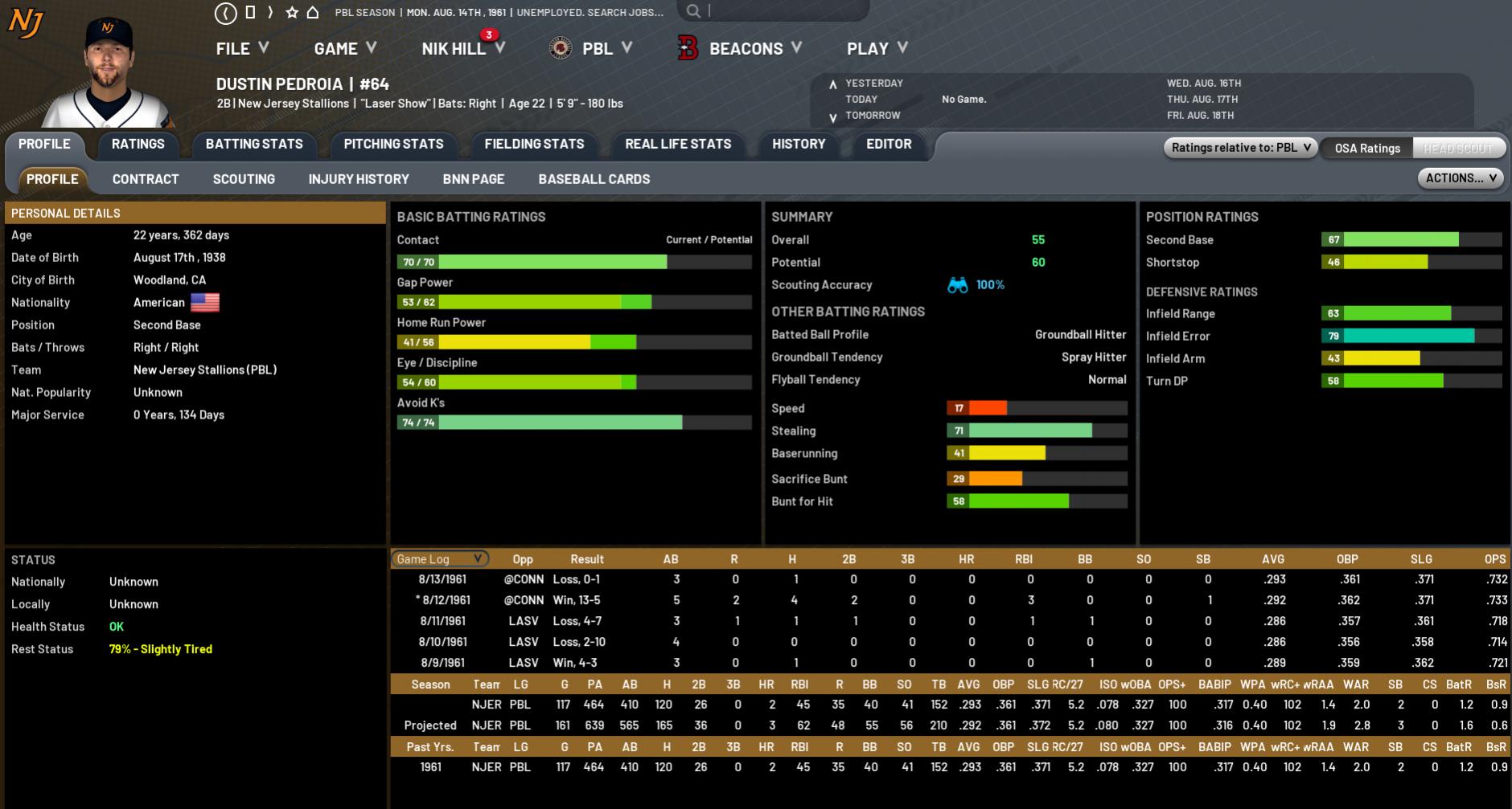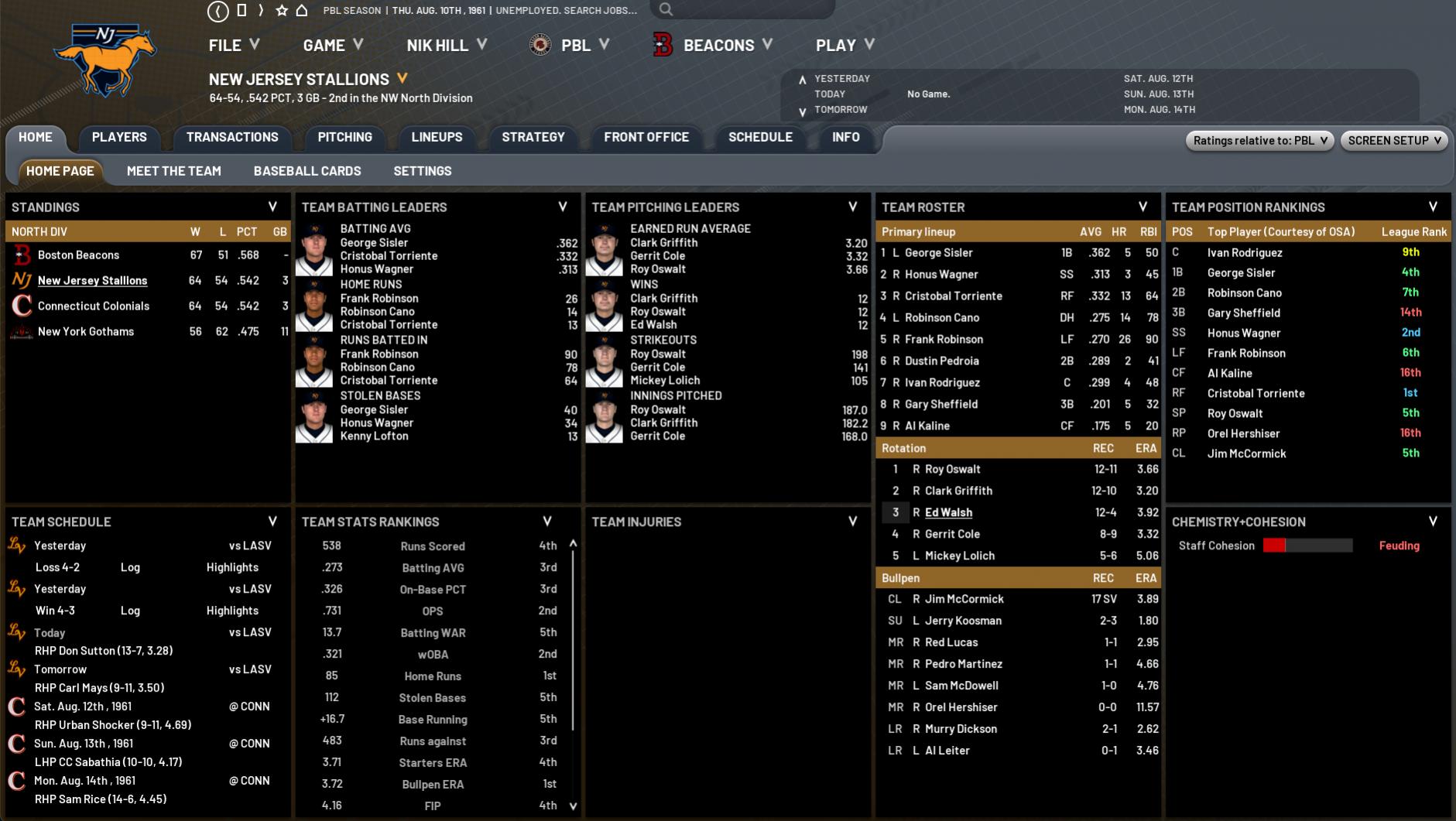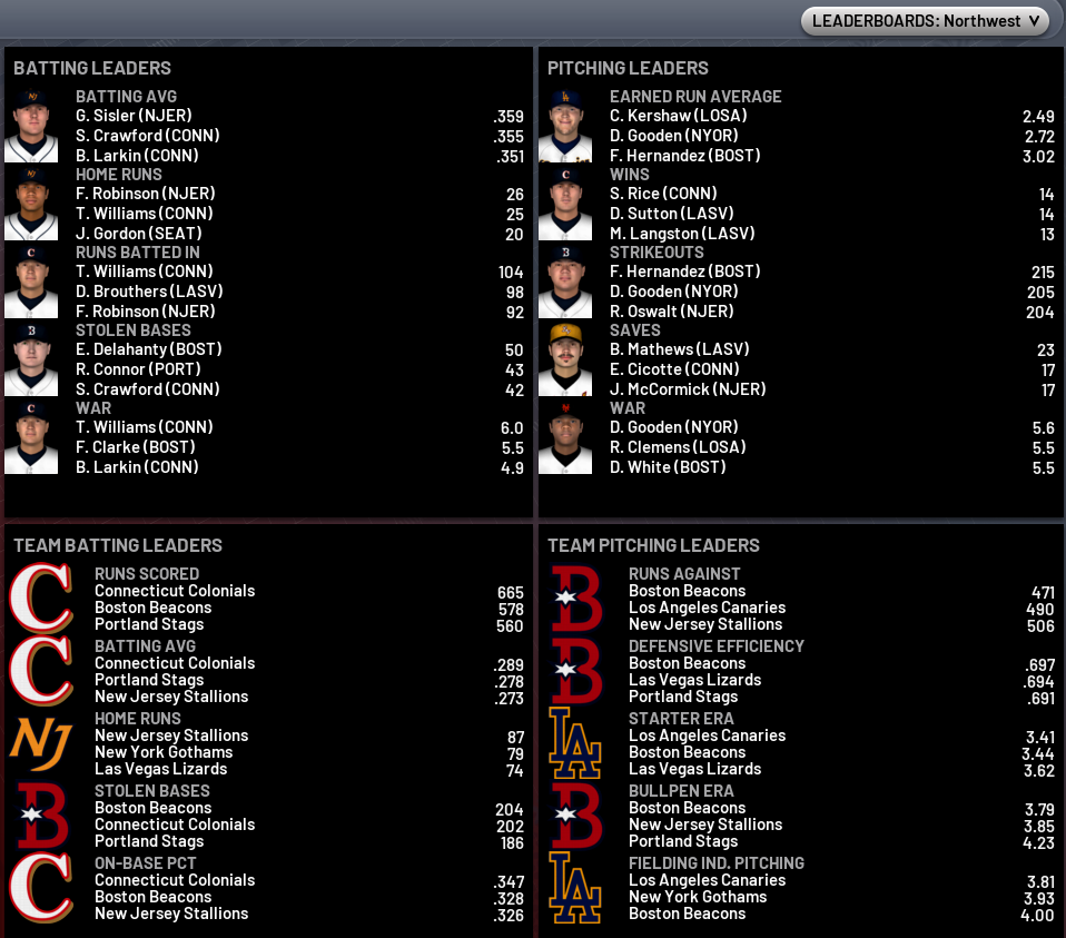 If the New Jersey Stallions are to see playoff action this season - and, at 64-54 and just 3 games back of Boston, there is a fair chance of this happening - then you'd have to think a lot of the credit for it will go to the two men whom some rag wag - OK, it was me - has started calling Jersey Family Robinson. It is hard to imagine two baseball players with personalities as dissimilar as Frank Robinson and Robinson Cano. Frank is a sombre and serene type, almost like some sort of baseball Zen Master - so much so that his nickname is "The Judge". Robinson, on the other hand... well let me put it this way. There were less ornate showboats ferrying people up and down the Mississippi in the time when Samuel Clemens decided to start calling himself Mark Twain and put pen to paper. And yet, from all reports, the two men are incredibly close teammates, rooming together on road trips and living just a few streets away from each other in Asbury Park, NJ. Go figure. Whatever the case, they certainly do seem to enjoy playing on the same team. Frank - who is usually stationed in left field but can also play right and first - is some chance to win the Northwest League MVP this year. His 26 home runs lead the PBL, and he is third in the NW with 90 RBI. Robinson, who holds down 2B and bats ahead of Frank in the clean-up spot, only trails his good friend in those two categories for the Stallions with 14 and 78 respectively, along with 28 doubles. Along with George Sister, Honus Wagner and Cristobal Torriente, the top five in the Stallions line-up is as good as any in the league, and it comes as no surprise that New Jersey ranks first in the NW for team HR (85), second in team OPS (731), and third in both team BA (273) and OBP (326). If anything, I believe this side has another gear it is yet to find this season, and will really give the Beacons and Colonials a run for their money over the final 50 games of the season. With the Robinsons of Jersey sure to be right in the midst of it.