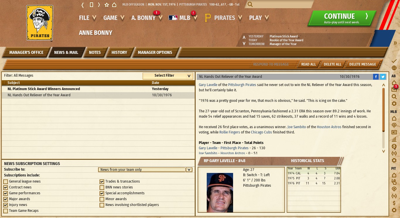 The pen is stronger than Gene Garber's 24th ranking as the top Pirate reliever would indicate. Rich Gossage is there but the game rates him as a starter.