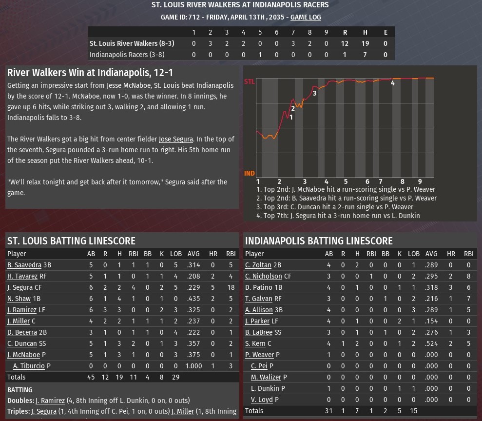 Jose Ramirez hit a two-run homer in the top of the first inning, and St. Louis never trailed in defeating Milwaukee 5-4 at Miller Park (2020). The win gave the River Walkers in two of the three games in the series. Bob Saavedra led off the game with a single off Crusher starting pitcher Scott Muller. Two batters later, Ramirez hit his fourth home run of the season to put St. Louis up 2-0. A solo homer from the Crushers' Nicolas Thibault off St. Louis starting pitcher Edward Kunselman cut the lead in half in the top of the second. Nick Shaw hit his sixth homer of the season, a solo jack off Mueller, in the top of the third to make it 3-1. Milwaukee came right back to make it 3-2 in the third. Caiden Matheny led off the inning with a double off Kunselman. Levi Usher brought Matheny home with a one-out double. The Walkers gave themselves some breathing room with two runs in the top of the seventh. Saavedra led off the inning with a double off reliever Tony Lujano. Jose Ramirez later drew a one-out walk. An errant pickoff throw by Lujano moved the base runners to second and third. Nick Shaw plated them both with a single. Thibault homered for the second time in the bottom of the eighth, it came off Nick Ruffalo, to pull the Crushers to within 5-4. But Nick Strother pitched around a lead-off walk in the ninth for his fourth save. Kunselman (2-2) earned the win after allowing two runs on four hits over 5.2 innings. He struck out seven and walked one. Zachary Stella got the final out of the sixth. Scott Rissler (0.2 IP) and Greg Sones (0.1) combined on a quiet seventh. Ruffalo's eighth was not quiet, as he gave up two runs to allow the Crushers to draw within 5-4. Strother shook off a series of bad outings in the ninth for his fourth save. |
