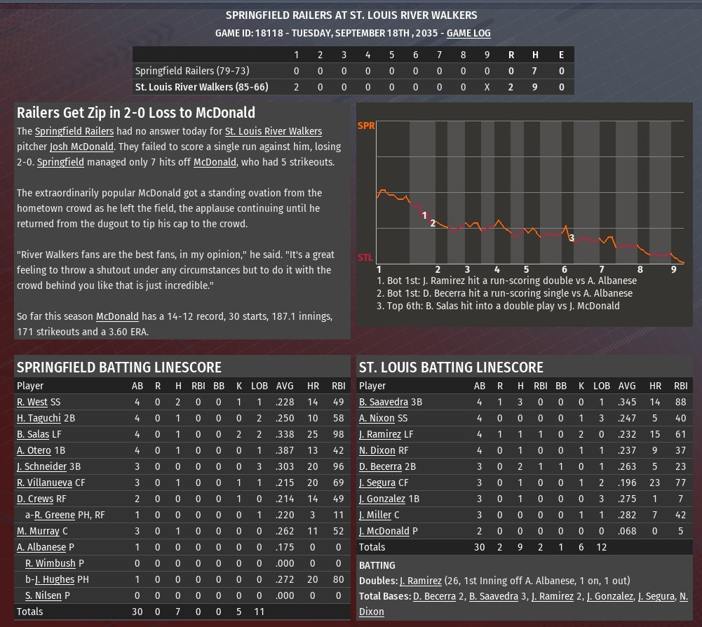St. Louis starting pitcher Josh McDonald held Springfield scoreless on seven hits while tossing a shutout in a 2-0 win at Busch Stadium (2006). It is the second career shutout, his first coming back in 2031 when he was pitching for Ann Arbor. All seven hits McDonald allowed were singles. He struck out five and didn't walk a batter while throwing 109 pitches. The only runs of the game came in the bottom of the first inning off Railers starting pitcher Alan Albanese. Bob Saavedra led off the bottom of the first with a single. He scored from second on a one-out double by Jose Ramirez. Daniel Becerra later scored Ramirez with a two-out single. Last edited by rink23; 09-28-2021 at 05:07 AM. |