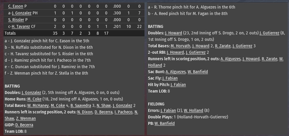 Cleveland may have gotten outhit, but it didn't get outscored as the Juke Box Heroes downed St. Louis 6-4 at Cleveland Stadium (1980). The win gave Cleveland wins in three of the four games in the series. A two-out RBI single from Manuel Coke off Heroes starting pitcher Keegan Jensen staked the River Walkers to a 1-0 lead in the top of the third inning. That advantage was gone by the end of the bottom of the second, as aided by a pair of walks from St. Louis starter Xavier Wigfall, Cleveland seized a 2-1 lead. Javy Gutierrez drove in both runs with a two-out single. The Heroes pushed their lead to 5-0 in the bottom of the sixth. It all started with a two-out single from Jon Howard. Howard stole second, which led to an intentional walk to Edgar Bustillos. Wigfall then issued another walk, this one to Will Holland, loading the bases. Nick Strother got the call, but former Walkers reserve catcher Will Banfield greeted him with a bases-clearing double. Gutierrez led off the eighth with a homer off Zachary Stella, putting the Heroes in front 6-1. St. Louis scored three times in the top of the ninth -- Nathaniel Dixon led off the inning with a homer (off reliever Mike Fagan) and Zach Wenman later hit a two-run homer (off Dominic Pipkin) - but it was not enough. Jensen went 3.2 innings, allowing one run on five hits. Jesse Gaither (5-1) earned the win after finishing the fourth and getting the game to the seveth. Dylan Cloonan and Fagan both recorded three outs. Dominic Pipkin got the first two outs of the ninth. Adam Wenger got his second straight one-out save, his 35th overall of the season, to end the game. |