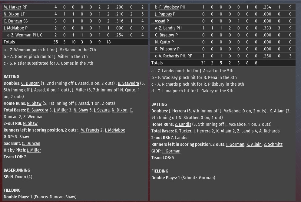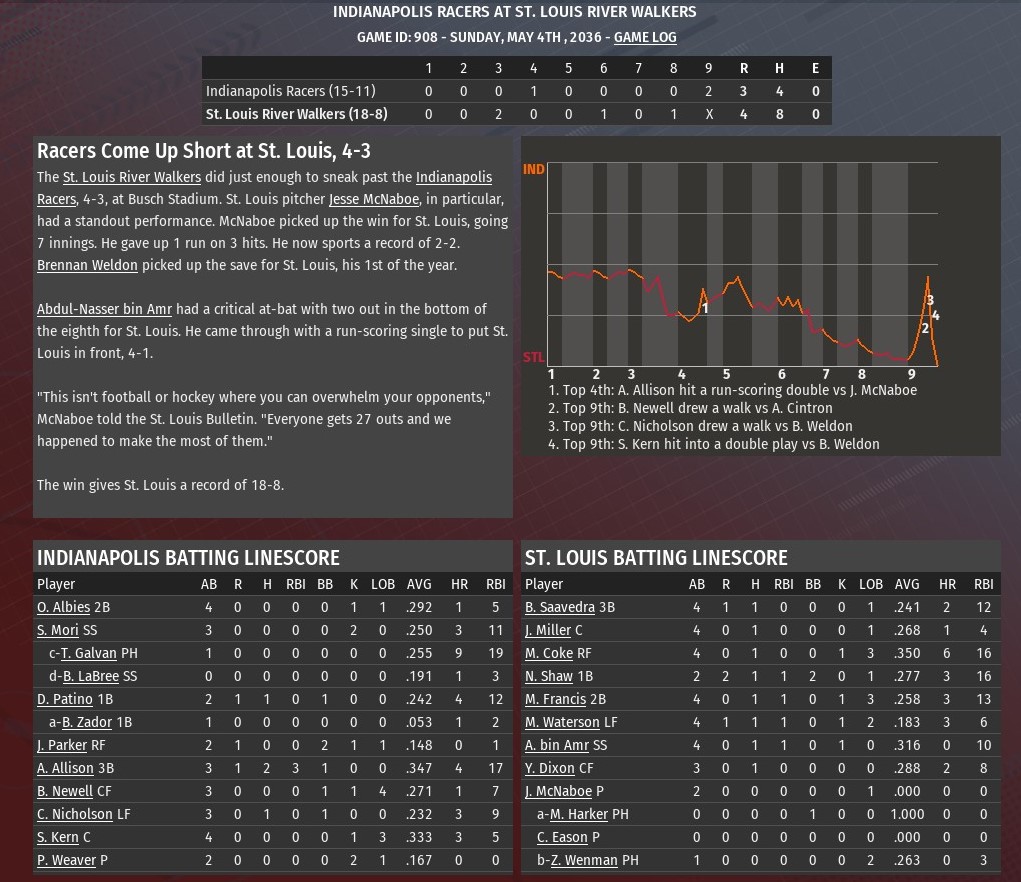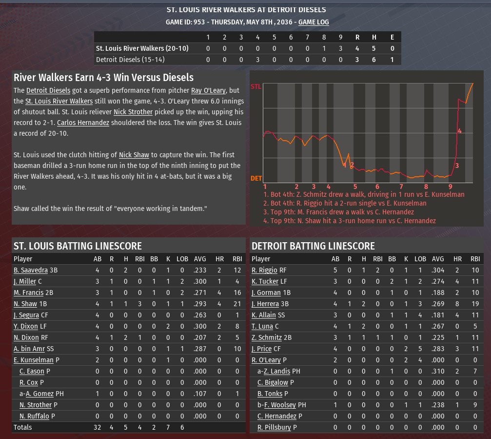 Tied 3-3, St. Louis scored three runs in the top of the seventh inning and held on for a 6-5 win over Detroit at Tiger Stadium (1980). The River Walkers put four straight batters on base against Diesels relief pitcher Carlos Hernandez to begin the inning. Marcos Francis and Bob Saavedra got things going with back-to-back singles to open the innings. Nathaniel Dixon followed with a double, scoring Francis. Jackson Miller was then given an intentional walk. Hernandez did retire the next two -- Alfredo Gomez on a strike out and Matthew Harker on a fly out -- but Nick Shaw connected on a double scoring two. Detroit did close the gap with a run in the eighth -- Lee Oakley doubled with two outs off Chris Eason and scored on a Zachery Schmitz triple -- and ninth on a two-out solo homer from Kyle Tucker off Ron Cox. But Brennan Weldon got Tony Luna to fly out to end it. Jesse McDonald (3-2) earned the win after allowing three runs on six hits over the first six innings. He struck out six and walked three. Greg Sones pitched a scoreless seventh and got the first out of the eighth, before Eason took over. Eason retired just one batter before giving way to Cox. Cox got the final out of the eighth and the first two in the ninth. Weldon earned his second save of the season. |