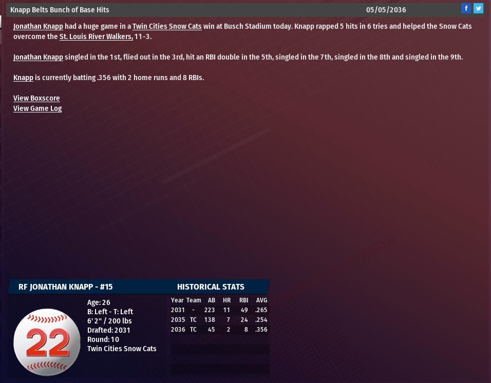 Wenman, 27, is expected to miss just four games but with starting catcher Jackson Miller already out with a minor injury, someone had to go on the IL. In 19 games this season, Wenman has hit .273 with six RBIs. Getting the callup from AAA Memphis is 24-year-old Manny Martinez In 1 games with the Redbirds, Martinez has hit .227 with two RBIs. Martinez already has played two games with the Walkers in 2036, in those he hit .571 with one homer and seven RBIs. |