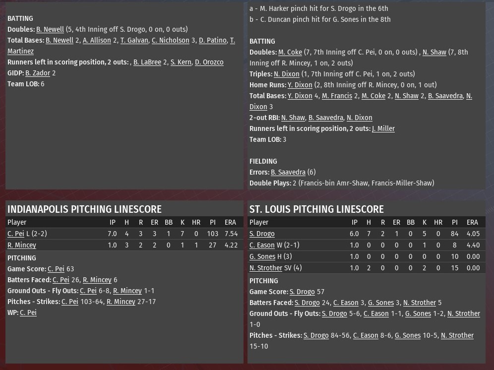 Tied 3-3, St. Louis scored three runs in the top of the seventh inning and held on for a 6-5 win over Detroit at Tiger Stadium (1980). The River Walkers put four straight batters on base against Diesels relief pitcher Carlos Hernandez to begin the inning. Marcos Francis and Bob Saavedra got things going with back-to-back singles to open the innings. Nathaniel Dixon followed with a double, scoring Francis. Jackson Miller was then given an intentional walk. Hernandez did retire the next two -- Alfredo Gomez on a strike out and Matthew Harker on a fly out -- but Nick Shaw connected on a double scoring two. Detroit did close the gap with a run in the eighth -- Lee Oakley doubled with two outs off Chris Eason and scored on a Zachery Schmitz triple -- and ninth on a two-out solo homer from Kyle Tucker off Ron Cox. But Brennan Weldon got Tony Luna to fly out to end it. Jesse McDonald (3-2) earned the win after allowing three runs on six hits over the first six innings. He struck out six and walked three. Greg Sones pitched a scoreless seventh and got the first out of the eighth, before Eason took over. Eason retired just one batter before giving way to Cox. Cox got the final out of the eighth and the first two in the ninth. Weldon earned his second save of the season. |