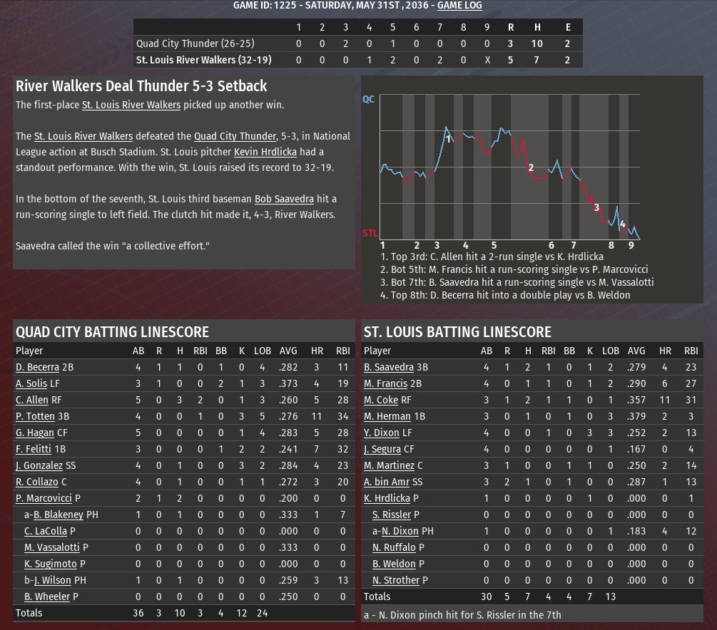 Tied 1-1, a two-run home run by Manuel Coke highlighted a three-run top of the seventh inning for St. Louis as the River Walkers defeated Evansville 4-1 at Yankee Stadium (1988). A home run from Yan C. Dixon in the top of the sixth off Bosses starting pitcher Fernando Maldonaldo had tied the game 1-1. St. Louis did its damage in the seventh against the Evansville bullpen. Bob Saavedra got things rolling with a single off Danny McCauley. A wild pitch, with Jackson Miller, at the plate moved Saavedra to second. He scored on a Miller single. Jeremy Kriech then replaced McCauley only to give up a 395 foot homer to right to Coke on an 0-2 pitch. St. Louis rookie starter Kevin Hrdlicka worked five innings, allowing one run on four hits. He struck out five and walked one. Brennan Weldon worked a scoreless sixth inning. Weldon (3-0) earned the win Bobby Westerman handled the seventh and eighth. Nick Strother kept it 4-1 in the ninth for his ninth save. Last edited by rink23; 11-04-2021 at 03:55 AM. |