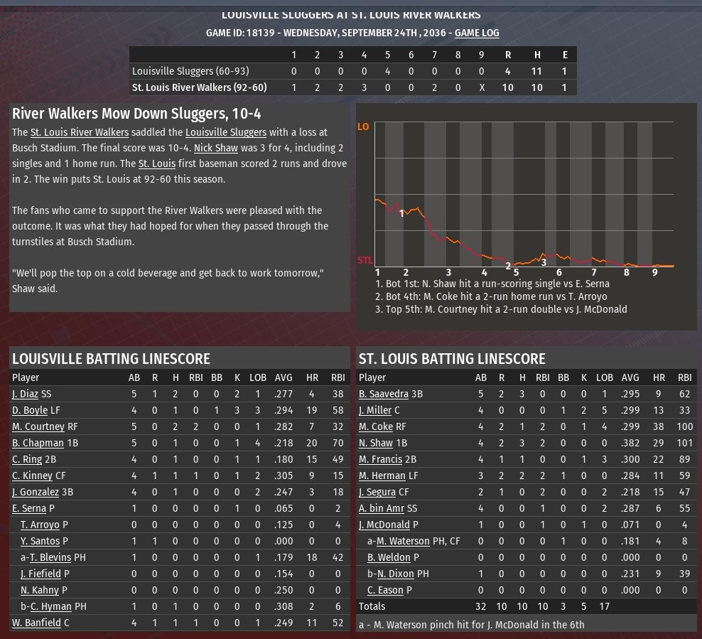 St. Louis scored eight runs over the first four innings to build an 8-0 lead, and the River Walkers breezed to a 10-4 win to complete a four-game sweep of Louisville at Busch Stadium (2006). Bob Saaverdra led off the bottom of the first inning with a single off Sluggers starting pitcher Esteban Serna, and later scored on a Nick Shaw single to put St. Louis ahead 1-0. The RBI was Shaw's 100th of the season. The Walkers then scored twice in the second and third innings before tallying a trio of runs in the fourth. A walk to Mark Herman followed by an error by Sluggers center fielder Caleb Kinney on a ball hit by Jose Segura opened the bottom of the second for St. Louis. Herman scored on a ground ball hit by Abdul-Nasser bin Am. Pitcher Josh McDonald got down a bunt to score Segura. The third featured Manuel Coke being hit by a Serna pitch to open the inning. Shaw followed with a single. Herman drove in Coke with a single. Segura collected an RBI with a fly ball to score Shaw. A two-run homer from Coke off reliever Tony Arroyo highlighted the fourth inning. The two RBIs gave Coke 100 for the season. Shaw made it a back-to-back with his 29th homer of 2036. Louisville did make it somewhat interesting with a four-run fifth against McDonald. Kinney led off the inning with a homer. The Sluggers banged out three more hits in the inning, including a two-run double by Mike Courtney. That was the end of the scoring for Louisville. St. Louis added two insurance runs in the seventh. Herman collected another RBI with a double, as did Segura with a sacrifice fly. McDonald (14-7) earned the win despite the one bad inning. He pitched six, allowing four runs on seven hits. He struck out eight and didn't issue a walk. Brennan Weldon worked two innings of scoreless relief. Chris Eason allowed Louisville to load the bases in the ninth but didn't give up a run. |