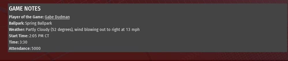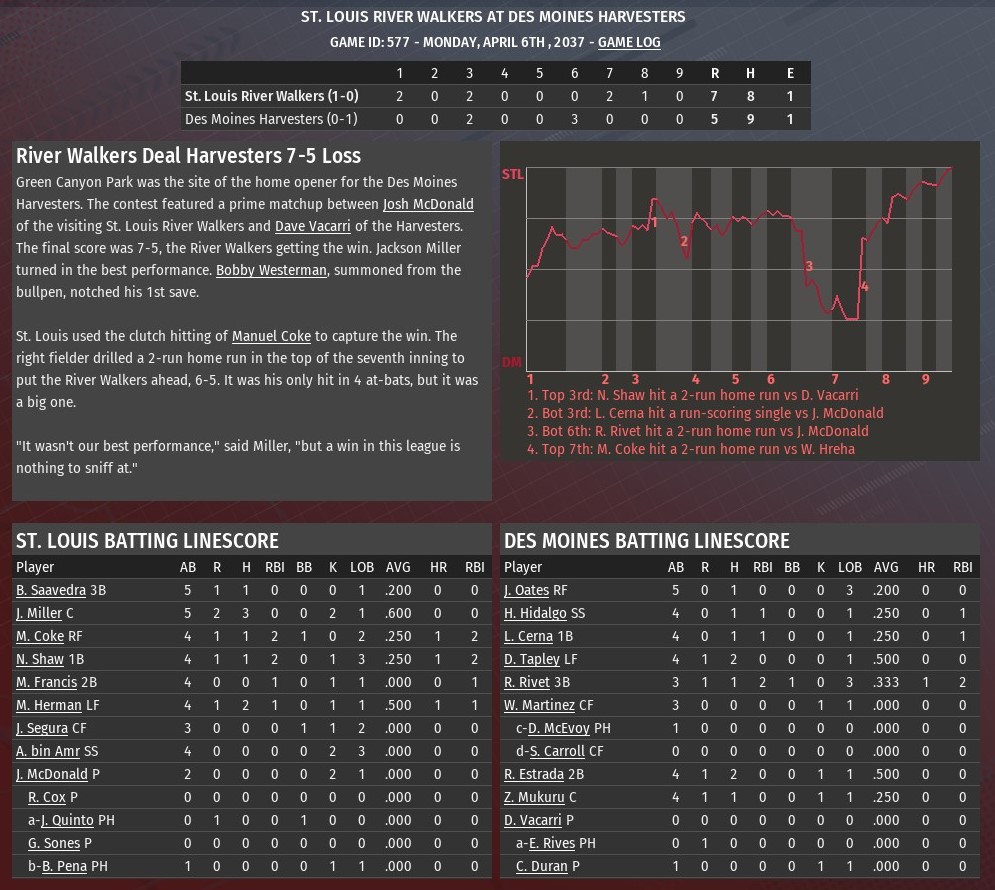St. Louis jumped out in front with four runs in the top of the first inning and also got a strong start from rookie Ming Xiang, as the River Walkers downed Cedar Rapids 7-1 at Connie Park Park (1960). Mark Herman provided the big blow of the top of the first with a three-run home run off Grapplers starting pitcher Joey Ross. Before that, though, Manuel Coke had scored Bob Saavedra with a sacrifice fly. Saavedra had led off the game with a bunt single. He had moved to third when Jackson Miller reached on an error by Cedar Rapids second baseman Mark Hill. The St. Louis lead grew to 5-0 in the top of the fourth, when Jean Segura led off with a triple off Ross. He scored when catcher Tim Jurgensen was charged with a passed ball. Now up 5-1, the final two Walkers runs came in the eighth. Nick Shaw led off the inning with his fifth homer, and 20th RBI, of the young season. It came off Keith Kirby. Herman later doubled and scored when Abdul-Nasser bin amr singled off Jordyn Ibarra. Xiang, making just his second start in the MBL after signing with St. Louis in the offseason, didn't allow a hit until Miguel Mena hit a solo homer with one out in the bottom of the fifth. Altogether, Xiang (1-0) went 5.2 innings, allowing the one run on two hits. He struck out six and walked three. Maxilliano Minelli, also a rookie, got the final out of the sixth and first out of the seventh. Ron Cox finished off the seventh for St. Louis. Brett McVey kept the Grapplers off the scoreboard in the eighth and ninth. |