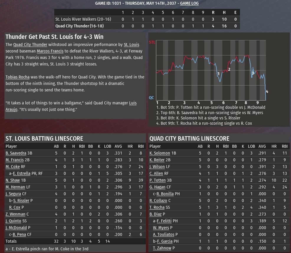 Down 3-2, Quad City scored single runs in the bottom of the eighth and ninth innings to defeat St. Louis 4-3 and complete a three-game sweep at Fenway Park (1975). Bob Saavedra had connected for an RBI single off Thunder reliver William Myers in the top of the sixth inning to give the River Walkers their 3-2 lead. In the bottom of the eighth, back-to-back singles by pinch-hitter Frank Garcia and Kyle Solomon off St. Louis reliever Scott Rissler set the stage for QC to tie the game when catcher Zach Wenman allowed a passed ball. The ninth saw Rissler issue a one-out walk to Paul Totten, before being relieved by Ron Cox. Cox got Ronny Bonilla to fly out. But Raul Collazo and Tobia Rocha both singled to bring home Totten with the winning run. Diaz worked five innings, allowing two runs on seven hits. He struck out three and walked two. Myers handled a pair of innings, getting the game to the eighth. Angelo Touliatos pitched a scoreless eighth. The win went to Terry Zahnow (3-0), after he did the same in the top of the ninth. |
