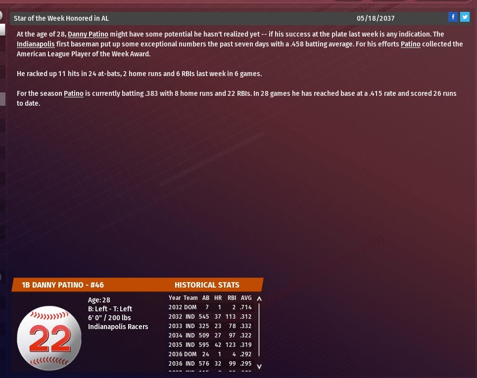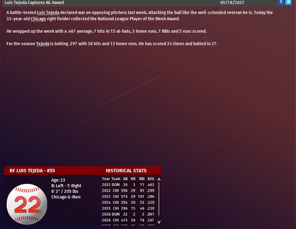 The trade of Bill Pena to Ann Arbor opened the door for Waterson's promotion. It is believed Waterson may get a shot to earn the starting center field job from the struggling Jose Segura. In 36 games this season at AAA, Waterson has hit .272 with six homers and 23 RBIs. Waterson has played in the majors before getting brief callup in 2035 and 2036. In 51 games with the Walkers, Waterson has hit .183 with five homers and 11 RBIs. |