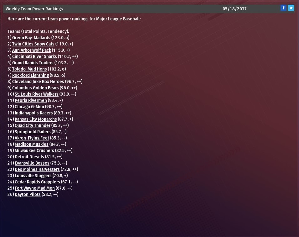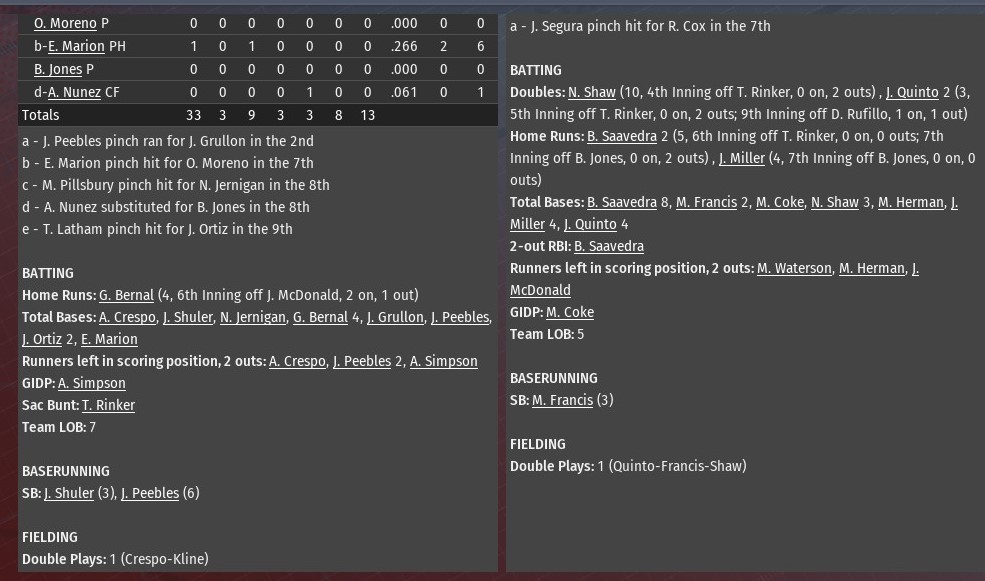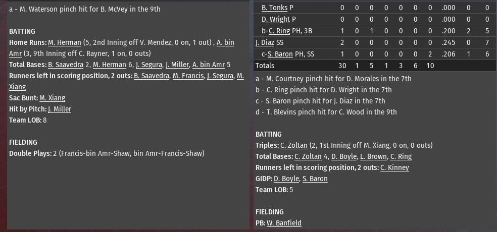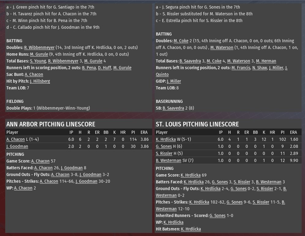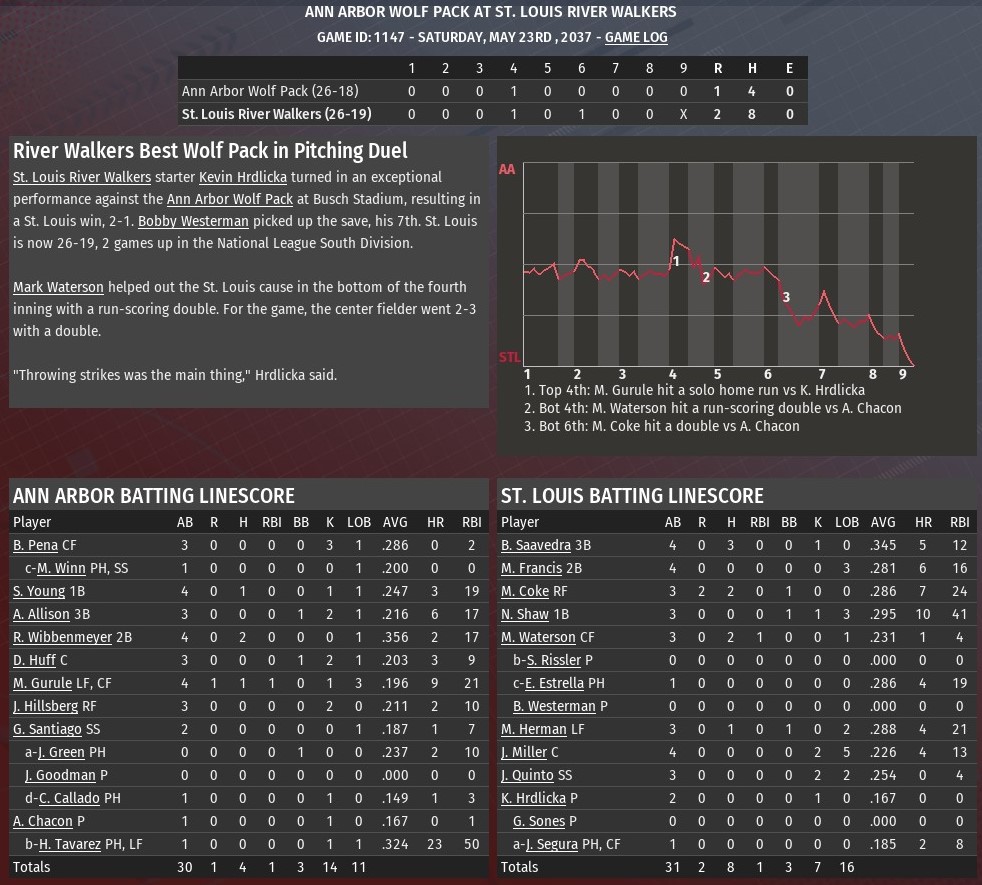 Hector Tavares homered twice, and Ann Arbor went deep three times in the first four innings to pave the way for a 6-2 win over St. Louis at Busch Stadium (2006). A former top prospect for the River Walkers, St. Louis traded Taveras to the Wolfpack during the 2036 season, in 2037 he has busted out. The 27-year-old hit a solo shots in the second and third innings off River Walkers starting pitcher Ming Xiang. For the season, Tavarez is hitting .331 with 23 homers and 50 RBIs with just 42 games gone in the season. His first homer put Ann Arbor ahead 1-0. The second was part of a three-run inning, which saw the Wolfpack go up 5-0. Shaun Young hit a two-run homer just before Tavarez second solo blast. Bill Pena, who St. Louis traded to Ann Arbor just last week, also had an RBI single in the inning. The Wolfpack extended their lead to 6-0 in the fourth. Pena drove in the run, connecting on a two-out single off Xiang to score Glenn Santiago. A two-run homer from Eddie Estrella in the bottom of the fourth off Ann Arbor starter Joe Alvarado accounted for the only runs for St. Louis. Alvarado (2-2) worked five innings, allowing two runs on six hits. He struck out eight and didn't issue a walk. Five relievers, four of them pitching a full inning, completed the game for Ann Arbor. Ryan Lodge (1.0 IP), was the first of them. He was followed by Scott Von Lehmden (1.0), Kyle Gatti (1.0), Duarte Picado (0.0) and Joey Thacker (1.0). Thacker, who started his career with St. Louis, earned his 14th save. |