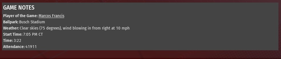 Jordan Quinto doubled with one out in the bottom of the ninth inning to score Mark Herman and give St. Louis a 4-3 win over Kansas City at Busch Stadium (2006). Herman had led off the inning with a single off Monarchs relief pitcher David Rufillo. After a strike out of Jackson Miller, Quinto lined a shot down the right-field line to score Herman. Gerardo Bernal hit a three-run homer of River Walkers starting pitcher Josh McDonald in the top of the sixth inning, putting Kansas City up 3-0. Bob Saavedra hit the first of his two home runs leading off the bottom of that inning, it came off Monarchs starter Travis Rinker, to put St. Louis on the board. An inning later, Jackson Miller led off the inning with a homer. Two batters later, Saavedra went deep again, both home runs came off Brandon Jones, to tie it. McDonald pitched five shut-out innings before allowing the three runs in the sixth. Overall, he allowed three runs on eight hits in six innings. He struck out three and didn't issue a walk. Ron Cox worked a scoreless seventh inning for St. Louis. Brett McVey got the first two outs of the eighth. Nick Ruffalo finished off the eighth and held KC scoreless in the ninth. Ruffalo (2-2) earned the win. |