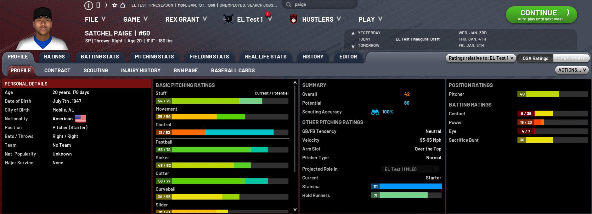 I feel I have been a bit of a sponge in the time since I became an OOTP alum, talking all of the great mod work across the spectrum while offering little in return. I try and chip in with help whenever the subject is something I am familiar with, but the fact of the matter is that I am neither tech-savvy enough nor possessed with the skills required to reciprocate in any meaningful manner on a regular basis. Consider this my attempt to redress this imbalance. As any of you who follow one or more of my numerous saves would likely be aware, I have been working away at a project to enable the importation of more accurately representative versions of Negro League players. This thread will share the fruits of my labour. A few key points before I begin. THESE ARE NOT PERFECT As much as I desperately hope that OOTP addresses the problem of NeL player imports at the ground floor, I'm not sure there even is a "perfect" fix available. The undeniable slippage between NeL and MLB stats means a true like-for-like correlation between the two is nigh on impossible. The gaps in both those raw stats and the supporting anecdotal data - even with the great strides having been and still being made in this regard - makes the proper "rounding out" of players equally, if not more, difficult. So, while I am confident my work takes us in the right direction by some margin, these profiles are merely educated guesses containing as much subjectivity as objectivity in place of hard, cold facts. THE PROCESS IS TRICKY Even for anyone with a decent working knowledge of the OOTP player editor, the process required to import NeL players using my profiles is not for the faint-hearted. I have tried to make it as straightforward as possible and explain it in the plainest terms, but there are elements that are just downright inscrutable. This is especially so with pitchers. So if you aren't willing to do the hard yards, I suggest you steer clear of any involvement with this and merely use the game-generated versions that you may even edit in a minor way to suit your needs. THESE PROFILES DO NOT WORK IN A RECALC ENVIRONMENT Recalc involves crosschecking and altering ratings against a player's historical stats with a frequency set by the player. As soon as these players are subject to recalc, the AI takes over and reverts them to being in line with their historicals, wiping the edited versions and ignoring the data entered manually upon import. So these will only hold their "shape" in games where only dev is on. I would also recommend you keep TCR way down when using these players. As I have posited elsewhere, I believe players import with a preordained "career path", and higher TCRs seem to magnify the diversion toward this path rather than the ones created using my profiles. So I recommend TCR at an absolute maximum of 25, but preferably at 10 or lower. RESULTS WILL DIFFER Different games mean different settings mean different universes mean different ratings environments. So, while the resultant player profiles should look similar they will differ from mine according to the settings you are using. The screenshots I'll be providing are from the full test environment for my Eclipse League. There are 6000 players in this and I suspect that the ratings of these good NeL players will appear higher than they will come out in most other settings. OK, enough with the caveats. Let's get on with the show.
