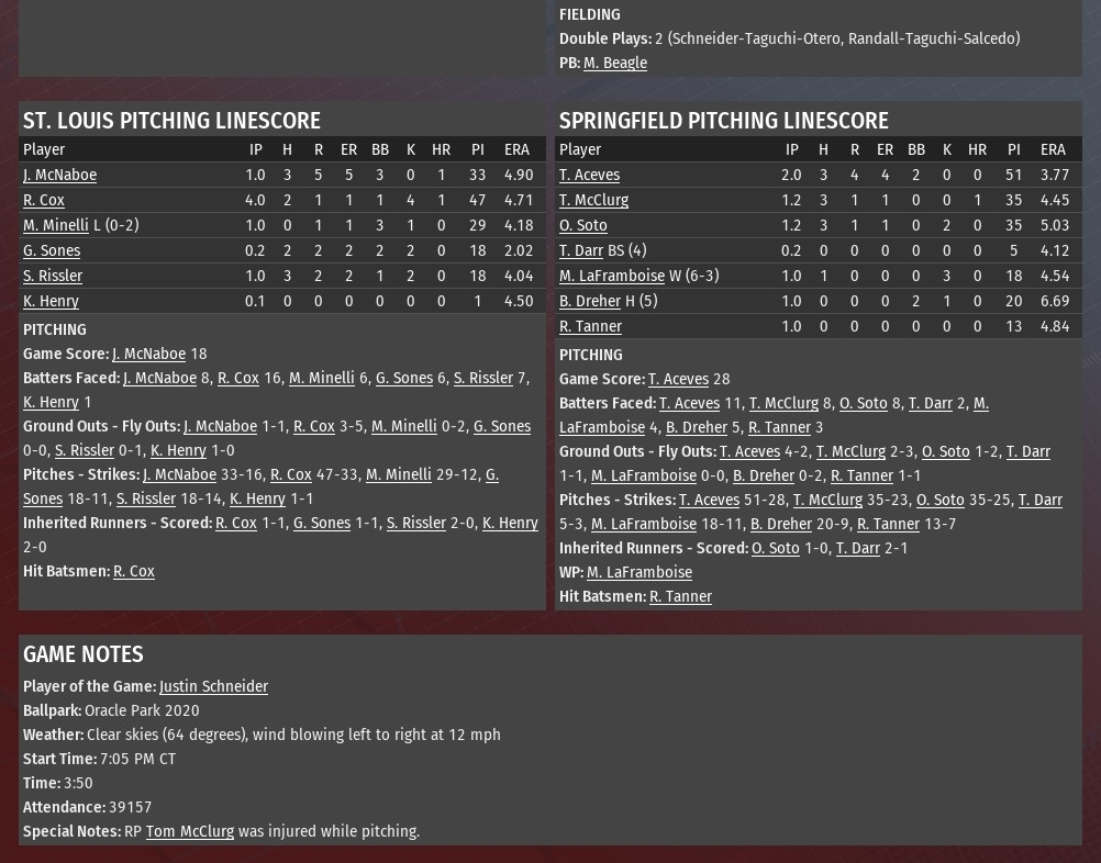 Tied 3-3, Cleveland roughed up St. Louis reliever Elvis Pool for three runs in the bottom of the seventh inning and the Juke Box Heroes went on for a 6-3 win at Cleveland Stadium (1980). The victory gave Cleveland a split of the four-game series. Pool had not given up a run in 11 outings since being called up by the River Walkers on August 26, but this game was different from the first batter. That would be, Luis Ruiz, who Pool hit with an 0-2 pitch to set the Heroes outburst in motion. Joey Kiernan followed with a triple to put Cleveland ahead 4-3. When Mac Horvath followed with a run-scoring double, Pool's day was done and the Heroes led 5-3. Horvath later scored on a two-out wild pitch by Maximilliano Minelli. Both teams had three-run innings earlier in the game. St. Louis tallied three times in the top of the third off Cleveland starter Hugo Vasquez. The Heroes evened in the bottom of the fourth against River Walkers starter Jesse McNaboe. Will Holland plated two of the runs with a double. Ruiz took care of the third with a single. Vasquez worked the first six innings, allowing three runs on eight hits. He struck out six and didn't issue a walk. After that, it was a string of scoreless innings from Adam Wenger, Nate Wilson and Josh Paul to close the game. Wenger (2-6) earned the win. Paul notched his fourth save. |