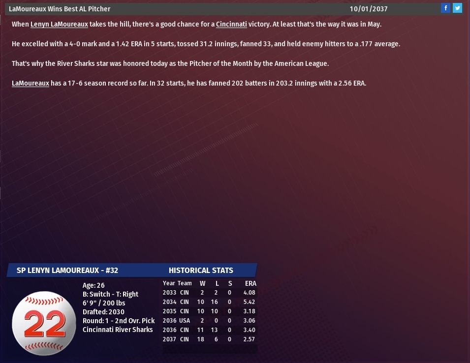 The victory gives the Sharks a five-game lead over second-place Cleveland with five games left in the season. Cincinnati sits at 91-69 while the Juke Box Heroes are 86-74. Lenyn LaMoureaux (18-6) became the first 18-game winner in the American League, allowing two runs on six hits over 6.2 innings. Troy Heller hit a three-run homer off Heroes starting pitcher Reinhold McKessey to give the Sharks a 4-2 lead. The playoff berth is just the first for Cincinnati dating back to the founding of the Midwest Baseball League in 2018. The Sharks made the playoffs in 2023 and 2024, winning the World Series in 2023. Last edited by rink23; 03-12-2022 at 04:45 AM. |