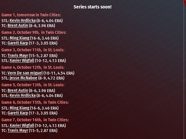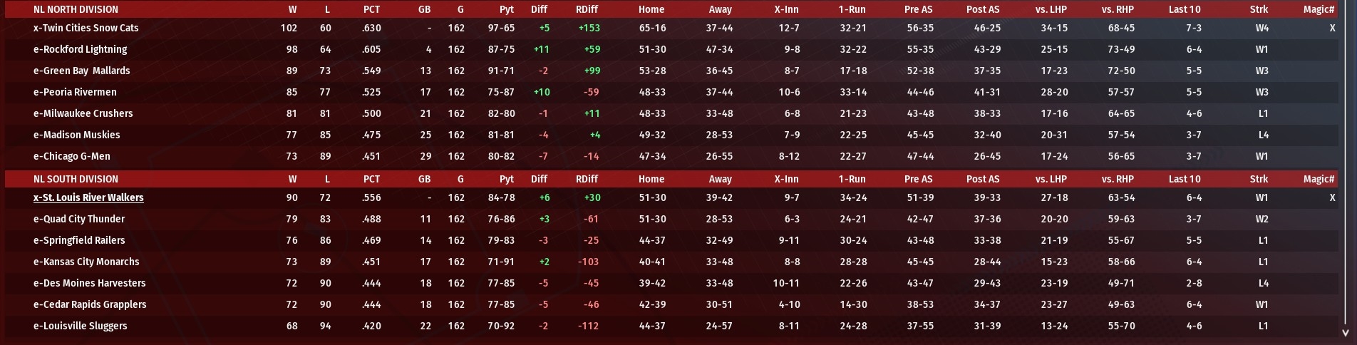 American League: Indianapolis Racers (89-73) vs. Cincinnati River Sharks (92-70) National League: St. Louis River Walkers (90-72) vs. Twin Cities Snow Cats (102-60) History Indianapolis: Division titles - 2032 and 2037; AL titles - 2032. Cincinnati: Division titles - 2023 and 2024; World Series titles -- 2023. St. Louis: Division titles - 2018, 2019, 2025, 2026, 2028, 2030, 2031 and 2036; NL titles - 2026, 2028 and 2030; World Series titles - 2018 and 2025. Twin Cities: Division titles - 2028, 2030, 2031, 2032, 2034 and 2035; NL titles - 2034; World Series titles -- 2031. |