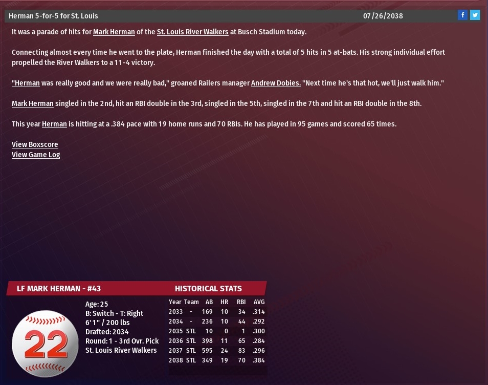 With two runs in the bottom of the second inning and five in the third, St. Louis jumped out to a 7-0 lead and never looked back in an 11-4 win over Springfield at Busch Stadium (2006). Mark Herman, who went 5 for 5 with two doubles, three runs scored and two RBIs, began the top of the second with his first hit, a lead-off single off Railers starting pitcher Alejandro Moto. Mark Waterson followed with a double, moving Herman to third. Herman scored on a Zach Wenman ground out, Waterson later scored on a wild pitch. A throwing error by Moto on a ball hit by lead-off batter Bob Saavedra set things in motion for the River Walkers in the third. Ryan Wibbenmeyer followed with a single. After a fly out, Nick Shaw singled, scoring two as Saavedra scored and Wibbenmeyer did as well following a throwing error by right fielder Carlton Randall. Mark Herman then connected on a double, making it 5-0. Manuel Santiago replaced Ceja. His fourth pitch, with a 3-1 count, landed 423 feet over the wall in left-center courtesy of Waterson. The score was now 7-0. Springfield did get its offense going in the seventh, banging out four hits including a pinch-hit grand slam Vincent Villaviencio. But 7-4 was as close as the Railers would come as St. Louis added a pair of runs both in the bottom of the seventh and eighth. Wenman drove in the two seventh-inning runs with a single off Mike Framboise. Manuel Coke and Herman both drove in runs in the eighth with doubles off Jesse Edwards. Brad Monroe (9-3) pitched six shutout innings for St. Louis before exiting after allowing a lead-off single in the seventh. For the game, Monroe allowed one run on five hits. He struck out eight and didn't issue a walk. Jesse Gaither got the first two outs of the seventh and allowed the Villavicencio grand slam. Kyle Smarr finished off the eighth. Alex Rios held the Railers scoreless in the eighth and ninth. Last edited by rink23; 04-11-2022 at 04:55 AM. |