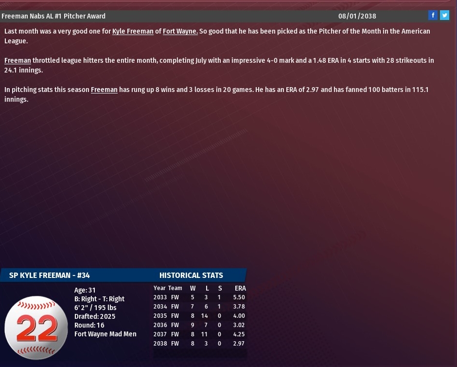Munoz, 30, has served as the closer for the Heroes this season having pitched in 36 games during which he has gone 2-4 with 20 saves and a 3.41 ERA. He also has three blown saves. For his career, Munoz has pitched in 594 games and posted a record of 30-38 with 113 saves and a 3.36 ERA. He has 37 career blown saves. This will be the second time Munoz has played for the Walkers. He spent part of the 2035 season with St. Louis, during which he went 2-2 with a 3.96 ERA in 38 games. Munoz was traded along with utility player Dan Hillard and starting pitcher Jim Martin to Madison in a deal which brought in relievers Bobby Westerman and Nestor Perez. In Proctor, Cleveland is receiving a 23-year-old right-hander who was selected in the 15th round of the 2035 draft This season, Proctor has played at AA Springfield where he has gone 3-12 with a 5.56 ERA in 21 starts. |