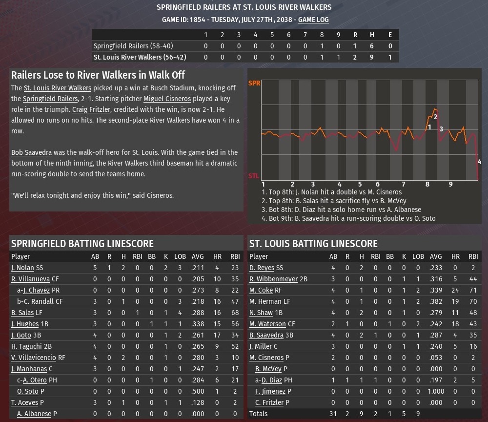 Chicago roared back from an 8-0 deficit to tie it 8-8 after six runs in the top of the eighth inning -- the G-Men later won it after scoring a run in the top of the 10th as they defeated St. Louis 9-8 at Busch Stadium (2006). The win was the second in a row for Chicago to complete the three-game series. The River Walkers cruised through the early portion of the game. Mark Waterson hit a two-run homer in the bottom of the first inning off Chicago starting pitcher Juan Gomez to highlight a three-run inning. The bottom of the fifth was even bigger with a Danny Diaz grand slam highlighting a five-run outburst which pushed the advantage to 8-0. But the G-Men got things going with a pair of runs off River Walkers starting pitcher Brad Monroe in the top of the sixth. Then came the top of the eighth when the Walkers bullpen fell apart. Jesse Gaither allowed the first two batters of the inning to reach bases. That set the stage for a three-run homer from Nate Carey. Kyle Smarr then took over for St. Louis, but the hits continued to come with Alfredo Cano and George Phelps both connecting for singles. Smarr finally did get an out, but it came on an Art McKee sacrifice bunt which moved the runners to second and third. Brett McVey then got the call. He promptly surrendered a double to pinch-hitter Jim Carr, which scored two and make it 8-7. Tony Nolasco was next. He continued the onslaught with a single to tie the game. When the carnage was over, the G-Men had scored six runs on eight hits. Two innings later, it was over, as Walkers closer Craig Fritzler could no keep Chicago from scoring. Ken Turner doubled with one out. He scored two batters later on a Jessie Willoughby double. Gomez lasted four innings, allowing four runs on six hits for the G-Men. He was followed by six relievers -- Devin Eyre, Joel Wisniewski, Keith Kirby, Lenyn Crisp, Nick Wilson and Adam Olmstead -- who all pitched an inning apiece. Wilson (1-0) earned his first win of the season. Olmstead notched his 21st save. |
