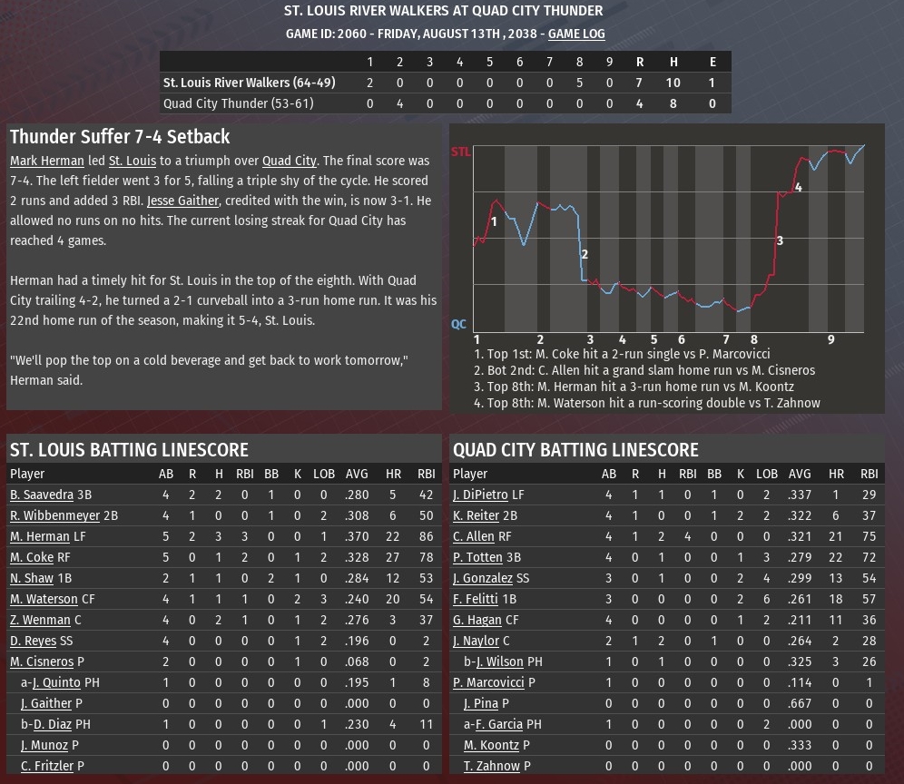 Zachary Schmitz led off the top of the 11th inning with a home run off St. Louis closer Craig Fritzler to help lift Detroit to a 3-2 win at Busch Stadium (2006). The Diesels got a strong start from Jordan Harrison, who pitched seven scoreless innings. Bill Webb then kept St. Louis off the board going into the ninth as Detroit held a 2-0 lead. The River Walkers, however, tied it against Salvatore Ramirez. Ryan Wibbenmeyer doubled with one out and Manuel Coke and Mark Waterson later connected for RBI doubles. The Diesels 2-0 lead had come courtesy of a two-run homer from Juan Herrera off St. Louis Miguel Cisneros in the top of the fourth. Harrison allowed just four hits (three singles, one double) in his time on the mound. He struck out two and didn't walk a batter. Webb worked a scoreless eight before Ramirez gave up the two ninth-inning runs. Tony Zaragoza (2-1) earned the win after two scoreless relief innings. |