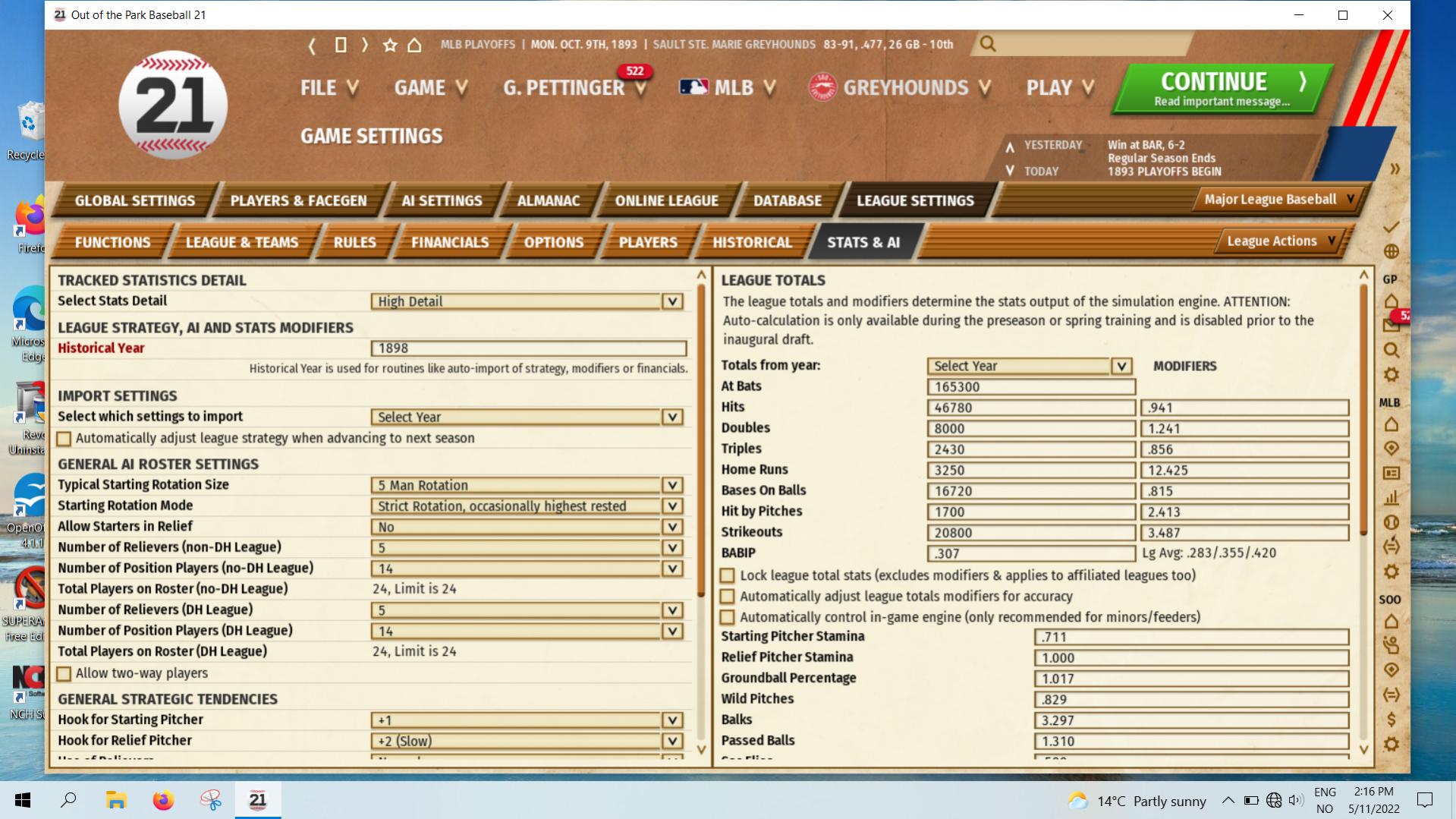 But look at the modifier value. ootp 23 is using a value of 3.000 and is what is generating the 80 home run player Ootp 21 is using 12.000 and is only generating a 50 home run player. Same game, same players, same number of teams, same environment. So that says the way the game is generating stats is WAY different now. And likely players historically are going to see a player or two just go off the charts each season. I also had Amos Rusie in 1890 go 31-2 in a 35 start season. I had never seen that in any of my previous saves. The point is expect big wide swings by players in seasons. Again not saying this is a bad thing, but something we should expect with 23. |